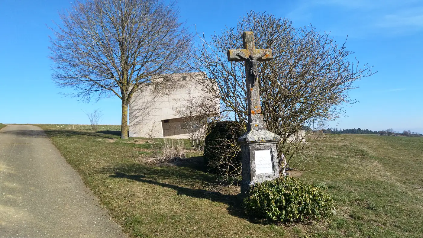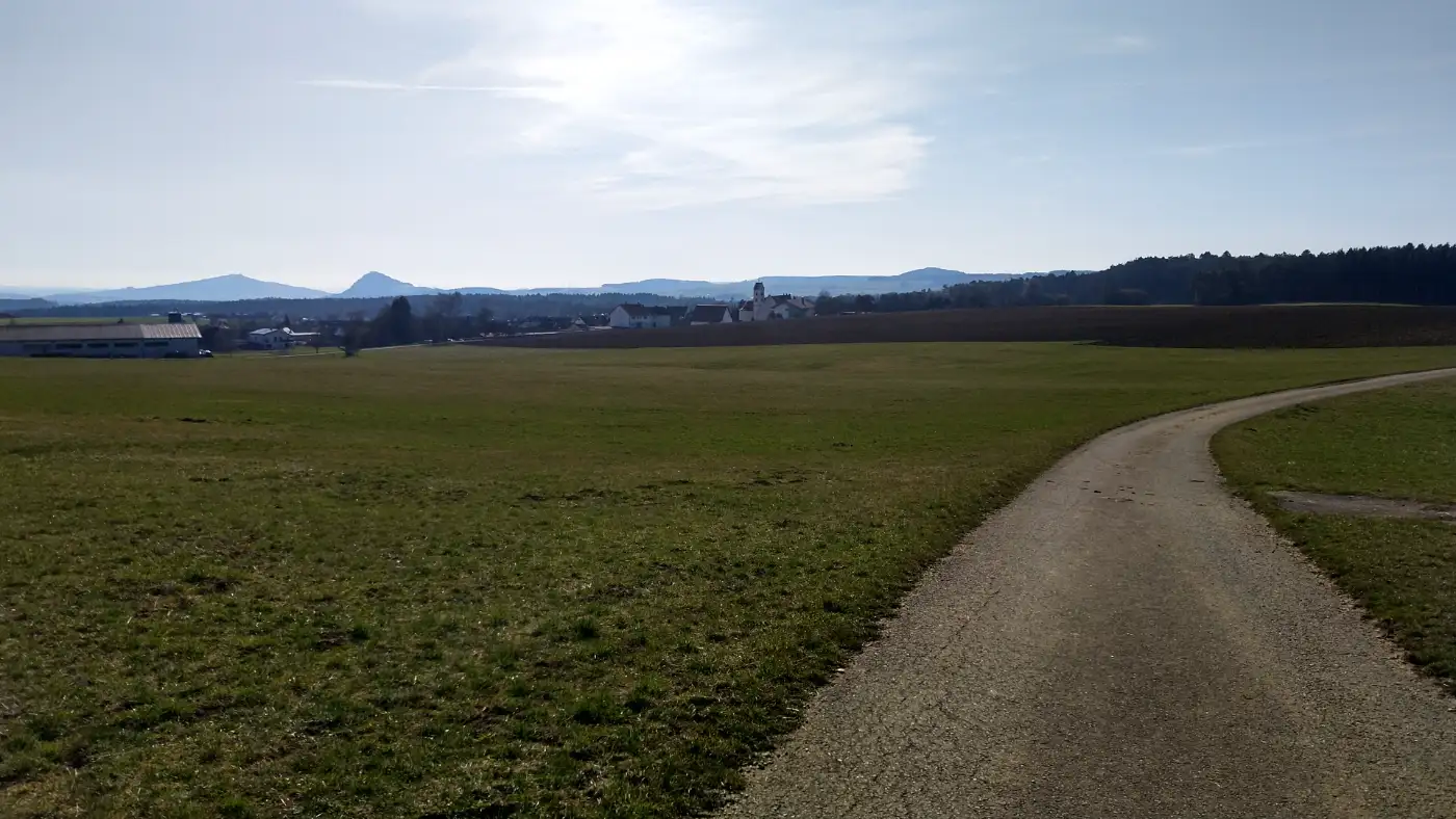 Unser Pfad windet sich stetig bergauf durch den Wald, bis wir schließlich wieder ins Freie treten. Während wir weiter über offene Wiesen an Höhe gewinnen, öffnen sich nach und nach immer weitere Ausblicke. Schon bald schauen wir hinunter auf Hattingen und erkennen in der Ferne die markanten Silhouetten der Hegauberge. Besonders deutlich heben sich der Hohenstoffeln und der Hohenhewen aus der Landschaft heraus. In der entgegengesetzten Richtung erkennen wir die Sendeantenne auf dem Witthoh sowie den hellen Marmorquader der Kapelle St. Johannes und Jakobus.Kapelle St. Johannes und Jakobus