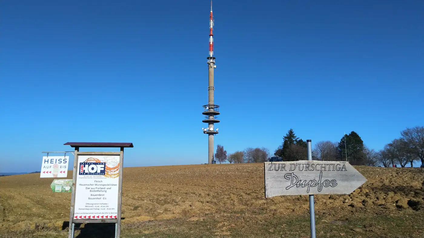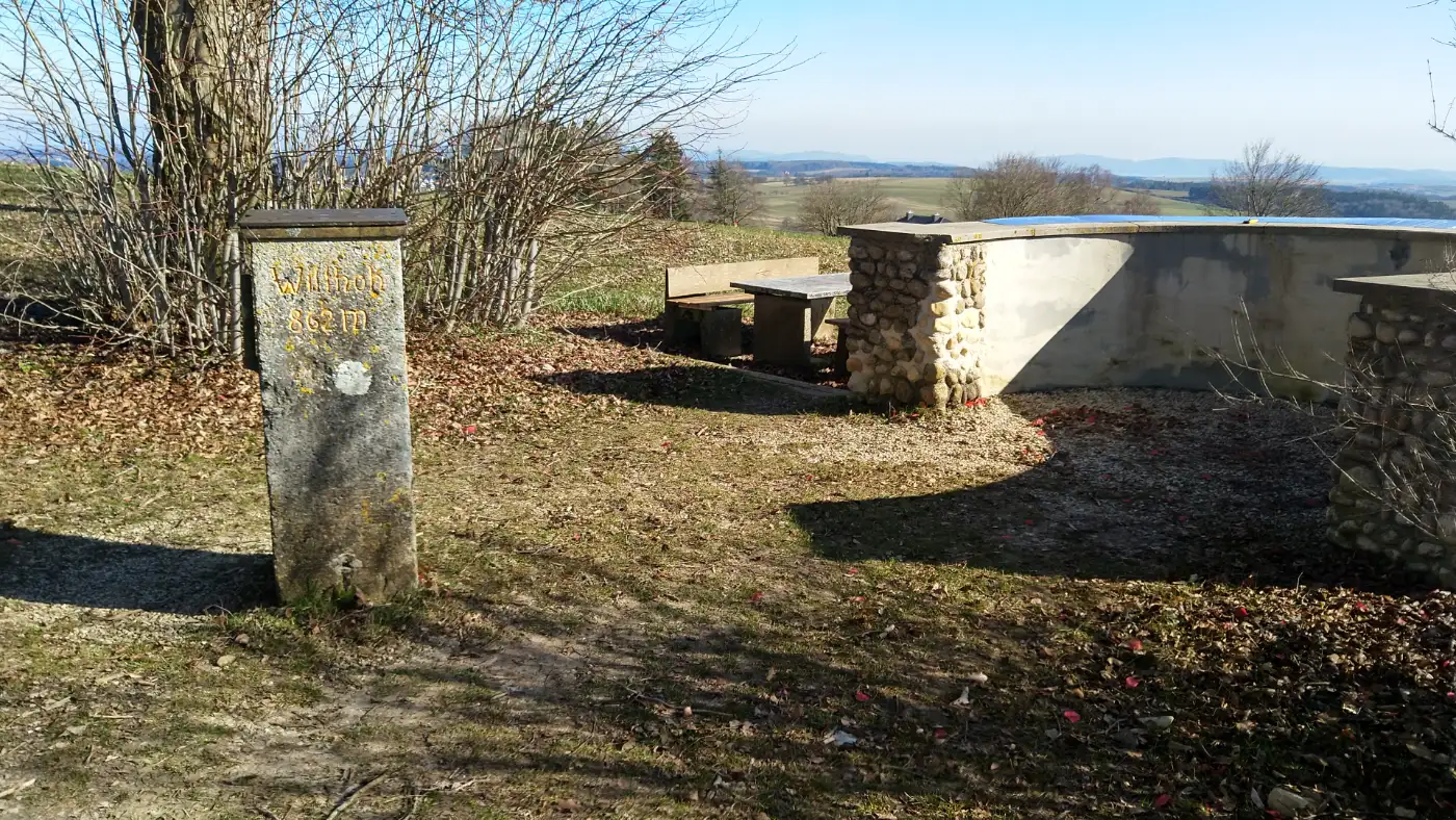 Nach einem weiteren Anstieg erreichen wir den Höhenrücken des Witthoh. Am Aussichtspunkt öffnet sich noch einmal eine beeindruckende Fernsicht über das Hegau-Bergland und die umliegenden Höhenzüge. Bei klarer Luft reicht der Blick weit über die Region hinaus. Wir lehnen uns kurz an das Geländer, lassen den Wind über die Höhe streichen und genießen die Weite. Dieser Abschnitt vermittelt besonders deutlich das Gefühl, über der Landschaft zu stehen.Brunnenkapelle und Rabenhof