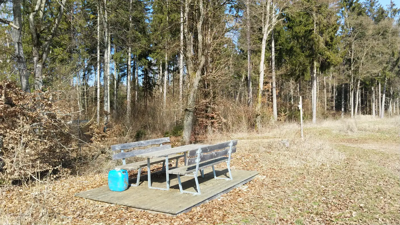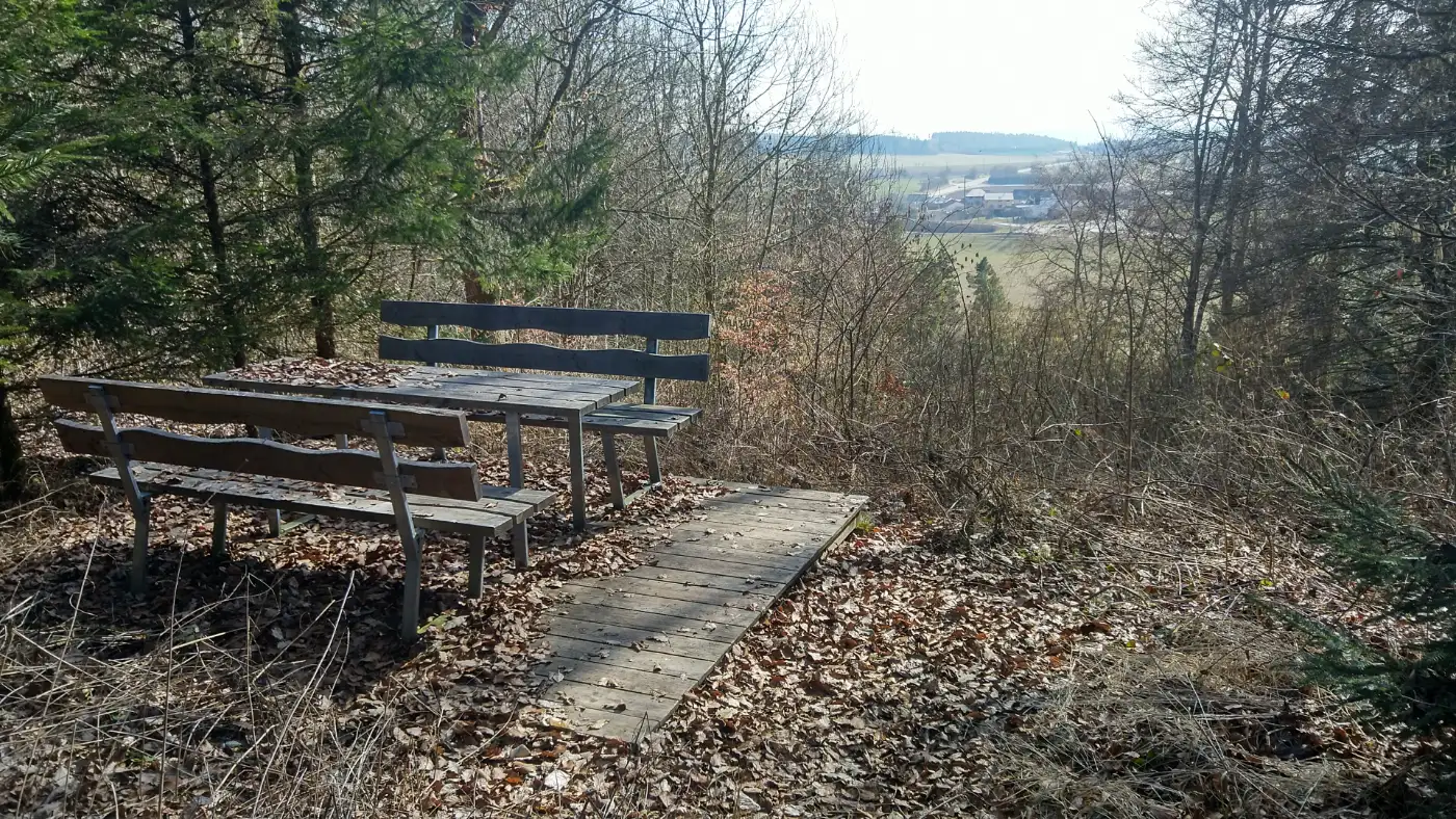 Kurz darauf stoßen wir auf einen liebevoll angelegten Rastplatz am Waldrand. Holzbänke und ein Tisch laden dazu ein, kurz innezuhalten und die Umgebung auf sich wirken zu lassen. Bei klarer Sicht reicht der Blick von hier sogar bis zu den Alpen; ansonsten schweift er über die sanft gewellte Landschaft des Hegaus mit ihren bewaldeten Höhenzügen. Wir nutzen die Gelegenheit für eine kleine Pause, bevor der Weg allmählich wieder ansteigt. Die ruhige Lage und die offene Aussicht machen diesen Platz zu einem idealen Zwischenstopp, um neue Energie für die nächsten Kilometer zu sammeln.Doline Michelsloch