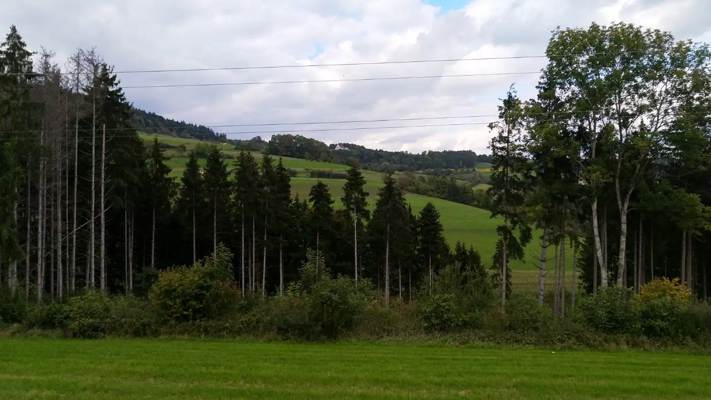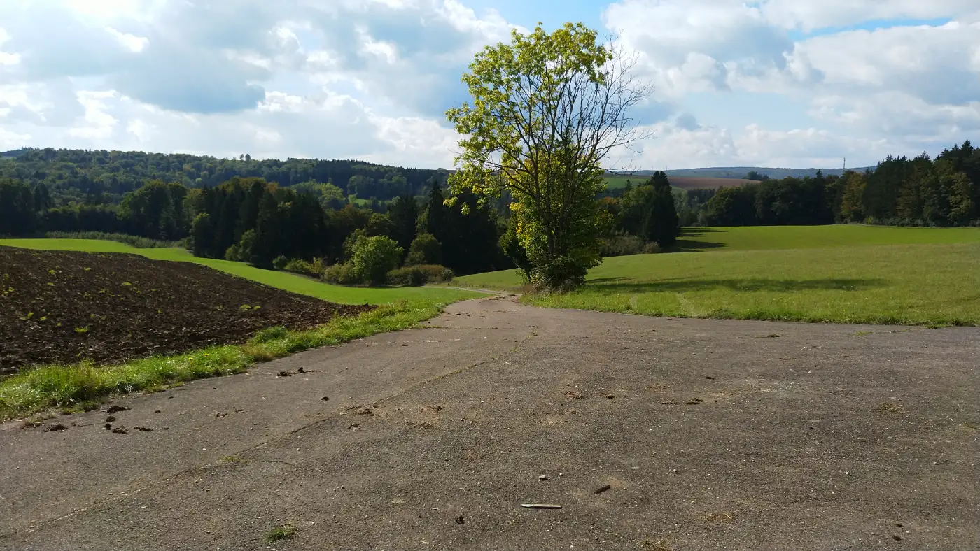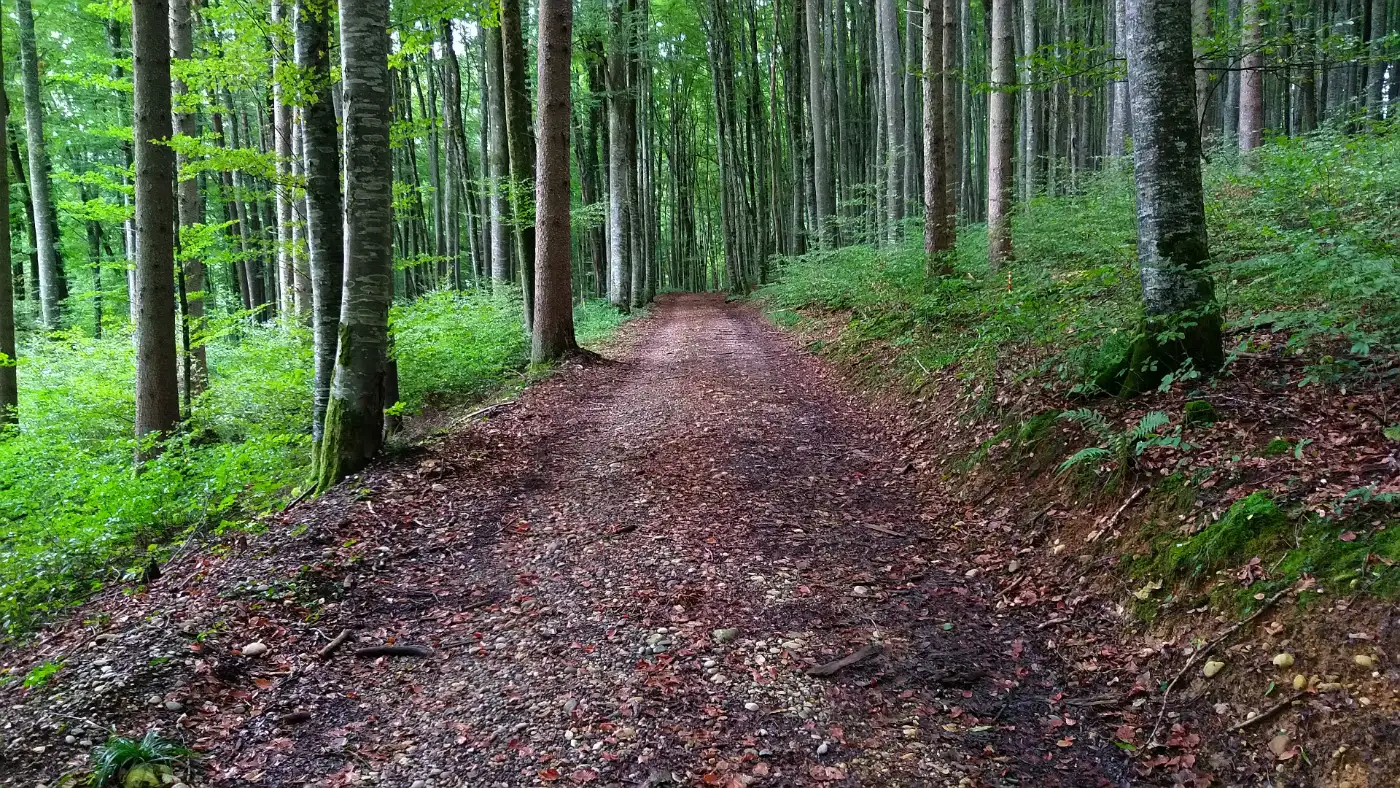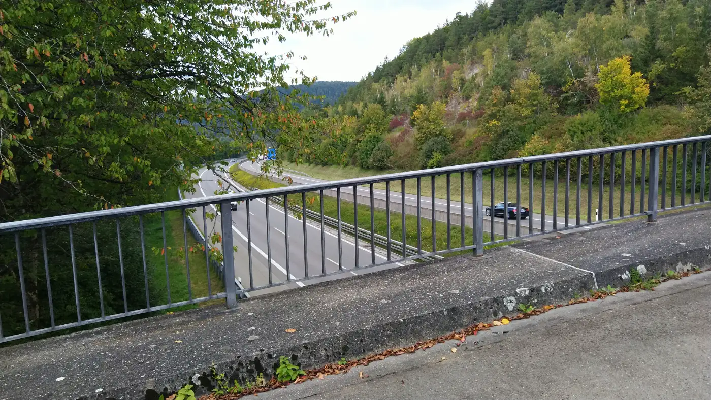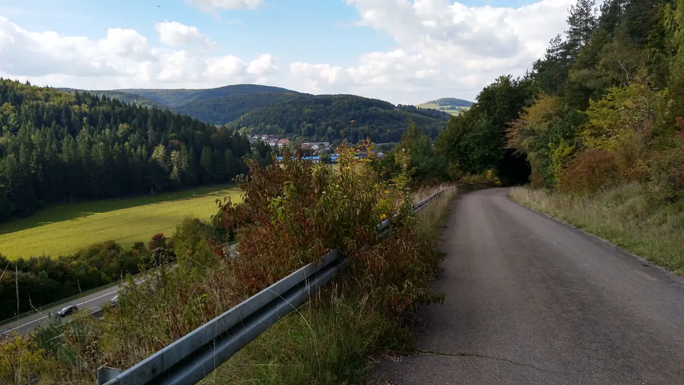 Abwechslungsreiche Wanderung durch Wälder, Wiesen und historische Ruinen im Hegau, vorbei an charmanten Brunnen und idyllischen Landstraßen. Wir starten unsere Wanderung an der Bahnhaltestation Geisingen-Hausen und folgen zunächst der Bodenseestraße in Richtung Engen. Nach etwa 100 Metern biegen wir auf die kleine Landstraße namens Schlössleweg ab, die uns sicher über die Autobahn führt und entlang der Autobahn in die abwechslungsreiche Hegau-Landschaft hineinleitet. Die Straße schlängelt sich durch Wälder und sanfte Hügel, sodass wir stetig an Höhenmetern gewinnen. Nach einer Kurve entdecken wir schließlich den schmalen Waldpfad, der direkt zur Sunthauserer Burg hinaufführt.Umgestürzter Baum versperrt Zugang zur Sunthauser Burgruine