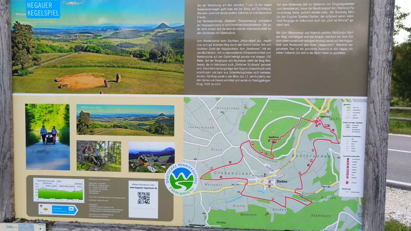 Schon bald erreichen wir die Autobahn und gehen sicher durch eine Unterführung hindurch, um unseren Weg fortzusetzen. Anschließend folgen wir dem Wegweiser "Burg Neuhewen", der uns weiter hinauf durch den Wald leitet. Schließlich verlassen wir an der Mauenheimer Landstraße den Wald und genießen eine weite Aussicht über den Hegau. Die markanten Vulkanberge erheben sich wie stille Wächter in der Landschaft, während sich Täler und Felder sanft ausbreiten. Wir verweilen einen Moment, um die faszinierenden Konturen der Vulkankegel und die abwechslungsreiche Natur zu bewundern, bevor wir unsere Wanderung fortsetzen.Besichtigung der Burgruine Neuhewen mit historischen Mauern