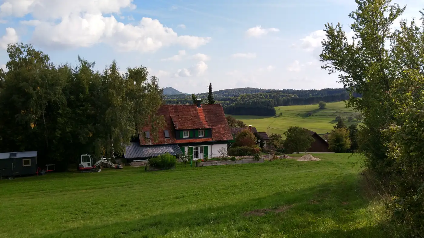 Auf dem kaum begangenen, zugewachsenen Weg stoßen wir auf einen umgestürzten Baum, dessen massiver Stamm den direkten Zugang zur Burgruine Neu Sunthausen blockiert. Von hier aus können wir keine Mauerreste oder andere Spuren der Burg erkennen, obwohl uns die GPX-Funktion unseres Handys signalisiert, dass wir uns eigentlich fast davor befinden. Die im 13. Jahrhundert errichtete Höhenburg wurde 1446 in einer Fehde mit der Stadt Schaffhausen zerstört und ist heute nur noch als Ruine mit wenigen Mauerresten erhalten. Wir entscheiden uns, umzukehren und den Weg sicher fortzusetzen. Wer möchte, kann jedoch den Baum überwinden und versuchen, im Dickicht noch Hinweise auf die längst vergangene Burg zu entdecken.Wanderweg führt vorbei an Wiesen und Feldern