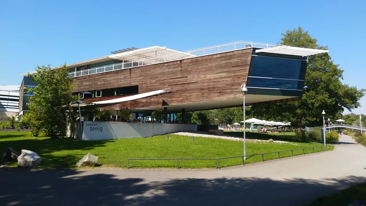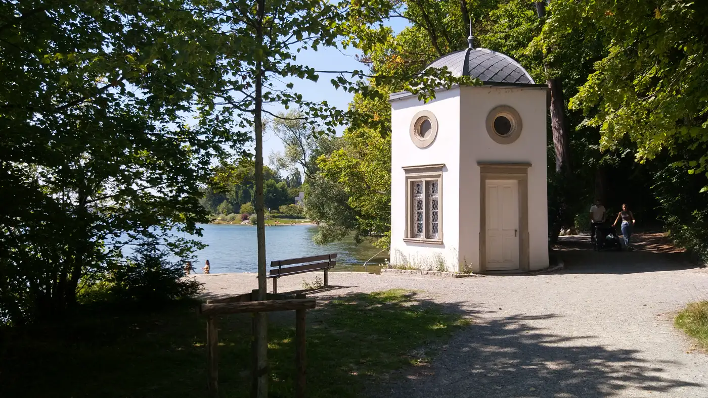 Weiter draußen am Ufer erreichen wir die Schmugglerbucht mit dem historischen Badehaus Rosenau. Der Ort wirkt etwas versteckt und hebt sich deutlich vom belebteren Weg ab. Wir werfen einen Blick auf das Wasser, das hier ruhiger erscheint, und lassen die besondere Atmosphäre auf uns wirken. Dieser Abschnitt erzählt von früheren Zeiten und verleiht der Route einen leicht geheimnisvollen Charakter.Bodensee-Therme Konstanz