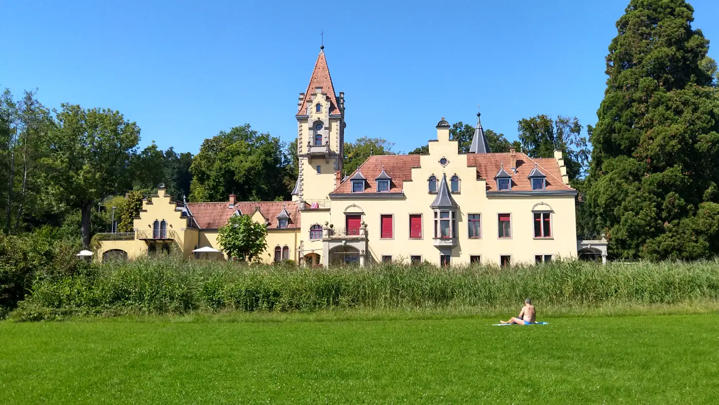 Kurz darauf erreichen wir die Bodensee-Therme Konstanz, deren moderne Architektur sich offen zum See hin ausrichtet. Das integrierte Restaurant Seelig befindet sich im oberen Bereich der Therme und bietet einen weiten Blick über den See. Wir gehen gemächlich vorbei und nehmen die besondere Mischung aus Erholung, Genuss und Landschaft bewusst wahr. Dieser Abschnitt verbindet Bewegung mit der Möglichkeit zur Pause und unterstreicht den entspannten Charakter der Route.Blickfang Schloss Seeheim
