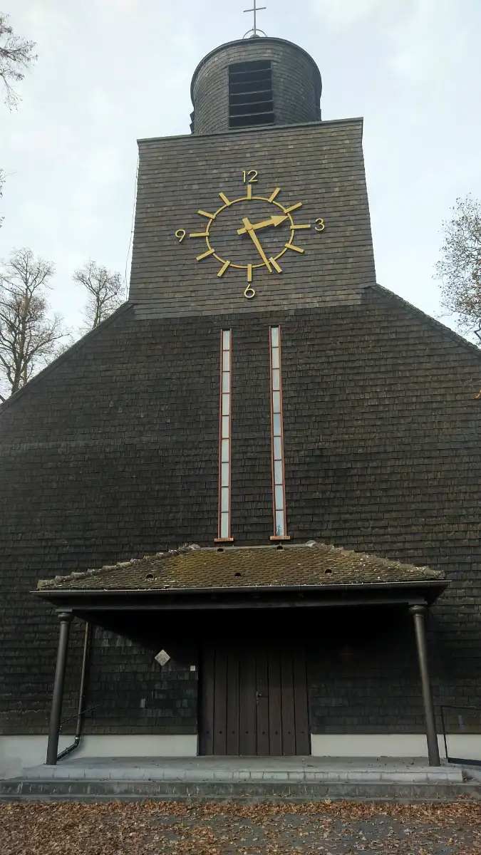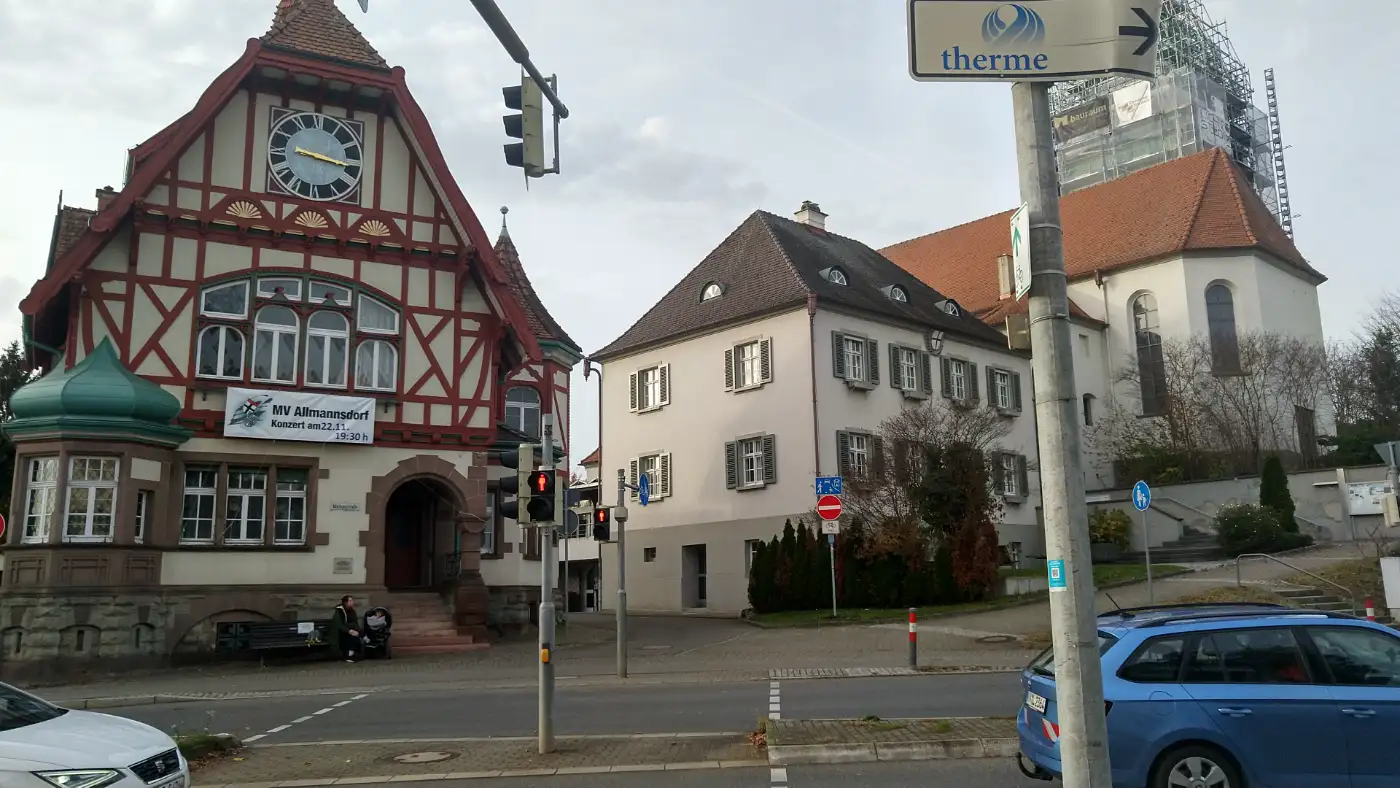 Kurz darauf ragt die evangelische Petrus und Pauluskirche vor uns auf. Wir nähern uns dem ungewöhnlichen Bau, dessen Außenhülle vollständig mit dunklen Holzschindeln verkleidet ist und der Kirche ihr markantes, fast schwarzes Erscheinungsbild verleiht. Diese Gestaltung hebt sie deutlich von den umliegenden Gebäuden ab und verleiht ihr eine schlichte, zugleich kraftvolle Wirkung. Die evangelische Pauluskirche liegt eingebettet in eine Parkanlage mit altem Baumbestand. Der grüne Raum rund um das Gebäude schafft Abstand zum Straßenverkehr und bildet für uns einen ruhigen Übergang vom urbanen Umfeld in die stilleren Viertel entlang unserer Route.Auf der Phillipsruh