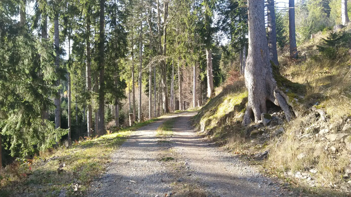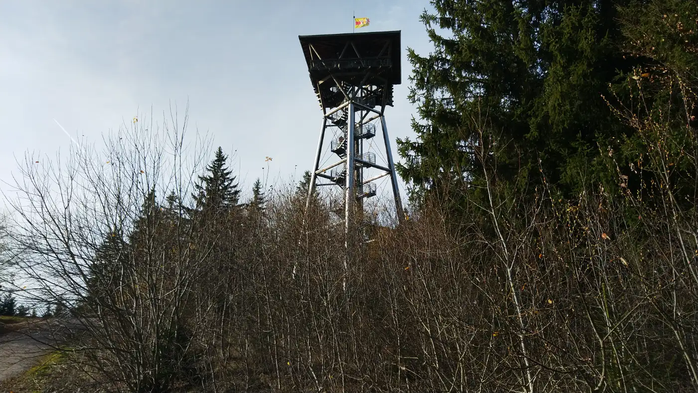 Nach kurzer Zeit erreichen wir den breiten Forstweg, den sogenannten Baumannweg, der uns in gleichmäßigem Tempo bergauf führt. Wir wandern durch dichte Nadelwälder, in denen das Sonnenlicht nur gedämpft den Waldboden erreicht. Der stetige Anstieg lässt uns langsam an Höhe gewinnen, ohne allzu fordernd zu sein. Immer wieder öffnen sich kleine Schneisen, die erste Ausblicke in die umliegende Landschaft ermöglichen. An den Waldhöfen angekommen, fällt unser Blick schließlich zum ersten Mal auf das Highlight unserer Tour: den Riesenbühlturm.Riesenbühlturm - Aussichtsturm