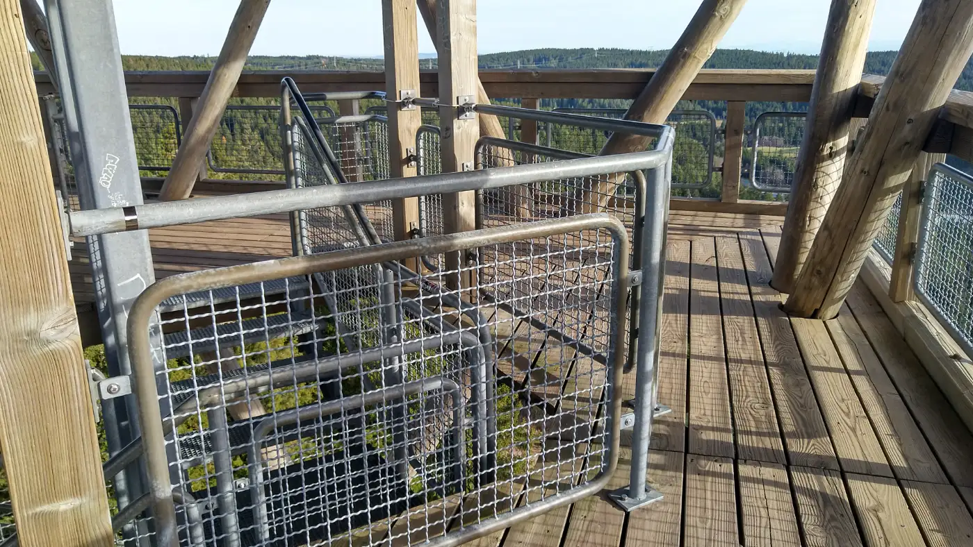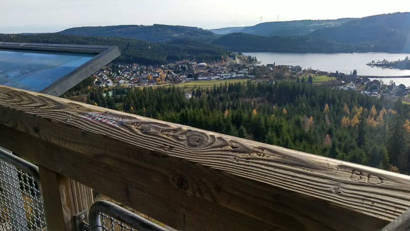 Am höchsten Punkt unserer Tour erreichen wir den Riesenbühlturm, der auf dem bewaldeten Berg Riesenbühl im südlichen Schwarzwald steht. Der Turm wurde im Jahr 2001 errichtet und ragt heute mit einer Gesamthöhe von etwa 35 Metern über die umliegenden Baumkronen hinaus. Wir steigen die Stufen hinauf und merken schon auf halber Höhe, wie sich die Aussicht zunehmend weitet. Der Eingang zum Turm befindet sich in rund 1097 Metern über dem Meeresspiegel, wodurch sich von der Plattform ein beeindruckendes Panorama über den Schluchsee und die umgebende Landschaft eröffnet.Aussicht vom Riesenbühlturm