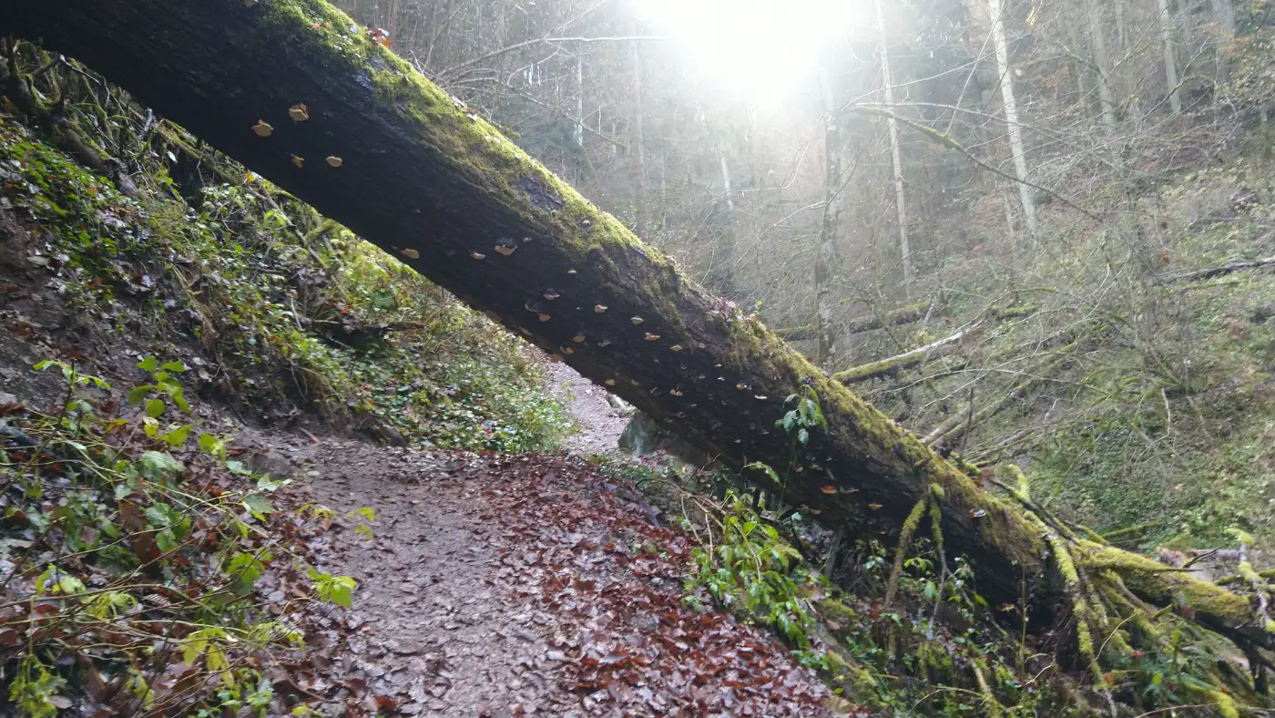 Etwa 100 Meter hinter Göschweiler biegen wir rechts ab und steigen über eine offene Wiese hinab. Der Pfad schlängelt sich anschließend durch lichte Waldstücke, vorbei an moosbewachsenen Felsen und uralten Wurzeln, die wie natürliche Treppenstufen wirken. Mit jedem Meter spüren wir den Wechsel der Landschaft: Das Rauschen der Wutach dringt immer deutlicher zu uns herauf und hallt zwischen den steiler werdenden Hängen wider. Die Vegetation wird dichter, die Luft spürbar kühler - ein untrügliches Zeichen dafür, dass wir uns einem der ursprünglichsten und wildesten Naturräume des südlichen Schwarzwalds nähern.An der Schattenmühle