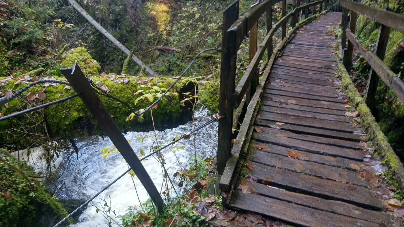 Unten im Tal erreichen wir die Schattenmühle, einen traditionsreichen Gasthof, der seit Jahrzehnten Wanderern als Rastpunkt dient. Der Ort wirkt wie eine kleine Oase mitten im Schluchtlabyrinth. Während das Wasser der Wutach direkt unterhalb vorbeiströmt, legen wir eine kurze Pause ein, füllen unsere Kräfte wieder auf und genießen die ganz eigene Mischung aus Ursprünglichkeit, Wassergeräuschen und Felskulisse. Von hier aus führt unser Weg weiter zum Einstieg in die Lotenbachklamm.Lotenbachklamm