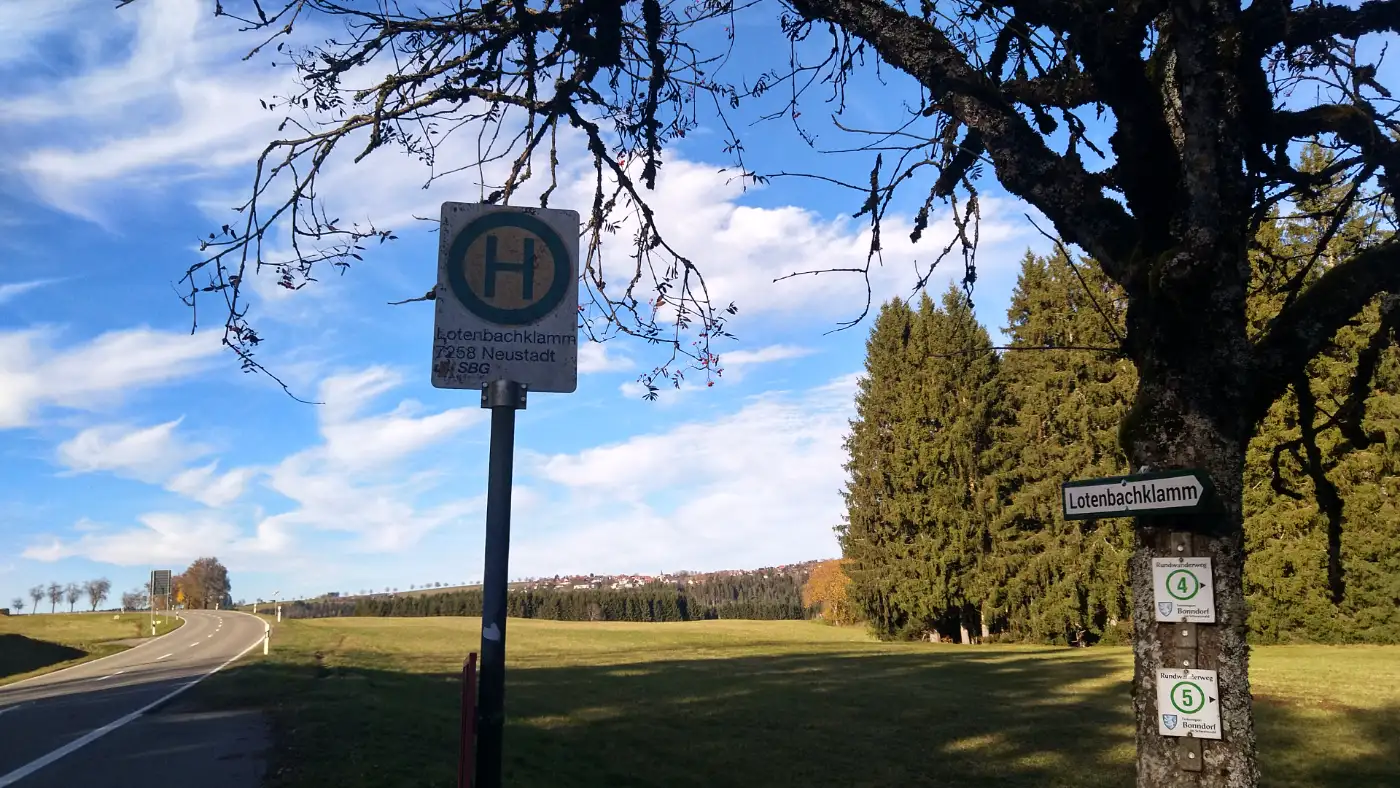 📅🚄Zur BahnauskunftDie Buslinie 7258 verkehrt stündlich zwischen Neustadt (Schwarzwald) und Bonndorf und bedient dabei auch die Haltestelle am Ausgang der Lotenbachklamm. Sowohl Löffingen als auch Neustadt sind zudem über die Höllentalbahn S10 erreichbar, die im Stundentakt Freiburg mit Villingen (Schwarzwald) verbindet.