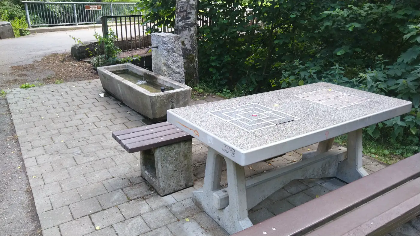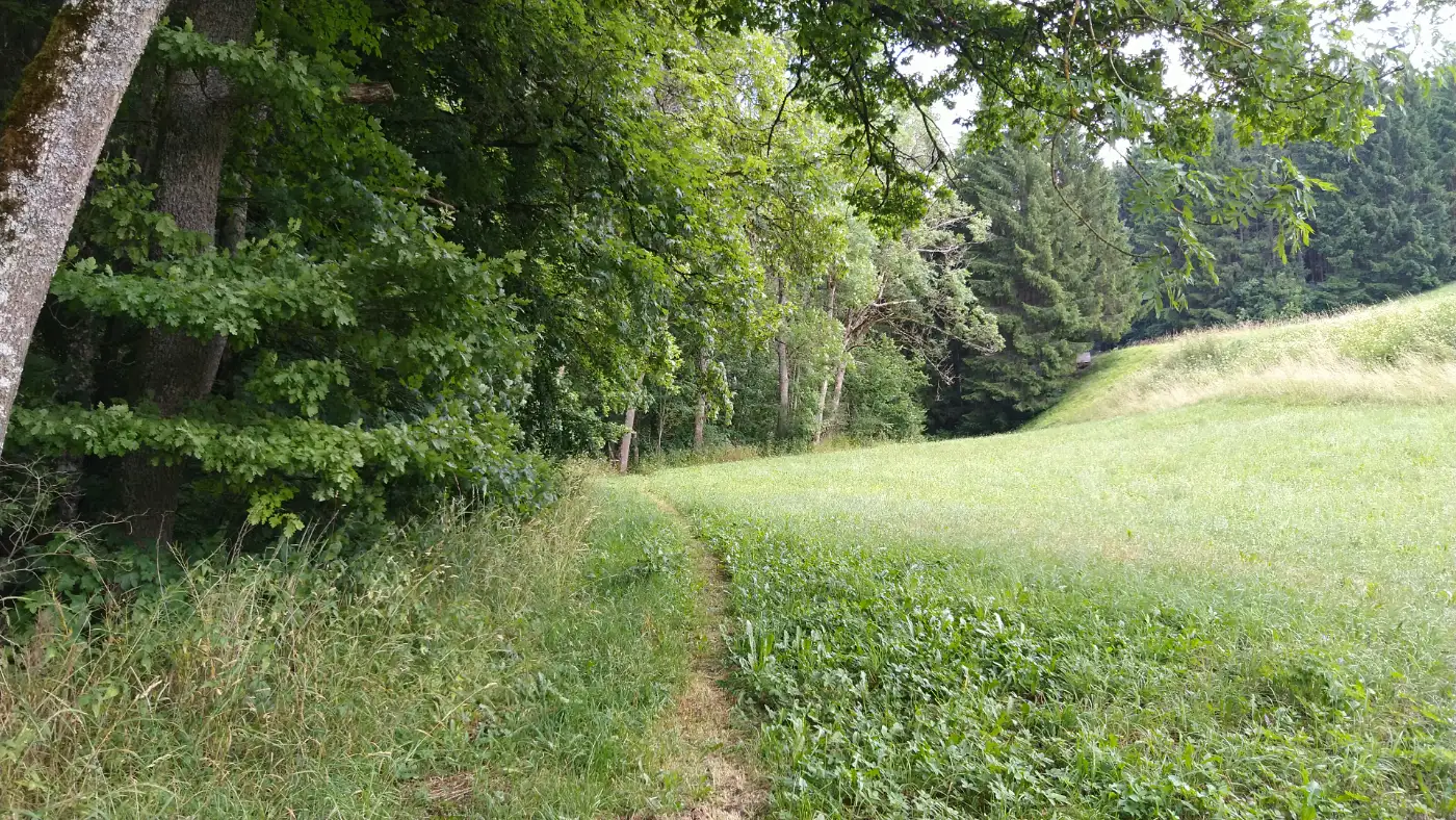 Der Weg führt weiter in dieselbe Richtung, und wir folgen dem dort aufgestellten Wegweiser mit der blauen Raute und der Aufschrift "Tierheim". Am Tierheim angekommen, sind wir bereits im Mauchachtal, ein Seitental der Gauchach im Hochschwarzwald. An diesem Ort befand sich einst das Reihendorf Mauchen, das vermutlich im 16. Jahrhundert der Pest zum Opfer fiel und schließlich aufgegeben wurde. Heute zeugen nur noch alte Flurnamen und Reste im Boden von der einstigen Siedlung - stille Spuren einer vergangenen Zeit, die in der Landschaft verborgen weiterleben.Das Nanteleloch