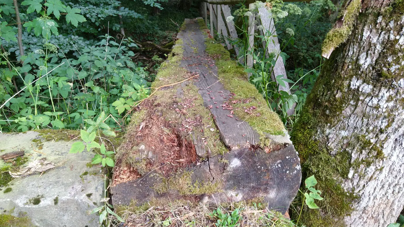 Nachdem wir das Nanteleloch passiert haben, führt der Weg weiter talabwärts in Richtung Posthaus. Immer begleitet vom sanften Plätschern der Mauchach, geht es auf schmalem Pfad durch den Wald - über mehrere kleine Einbaum-Brücken, die teils abenteuerlich den Bach überspannen. Der Weg bleibt abwechslungsreich, schlängelt sich entlang von moosbewachsenen Felsen und führt schließlich unter dem imposanten Eisenbahnviadukt Aubrücke hindurch - einem beeindruckenden Bauwerk der Höllentalbahn. Bald darauf erreichen wir die gemütliche Unadinger Sängerhütte, einen beliebten Rastplatz für Wanderer. Hier können wir auf den Bänken verschnaufen, die Stille des Waldes genießen und uns auf die nächsten Etappen vorbereiten.Mauchachtal Wegtunnel