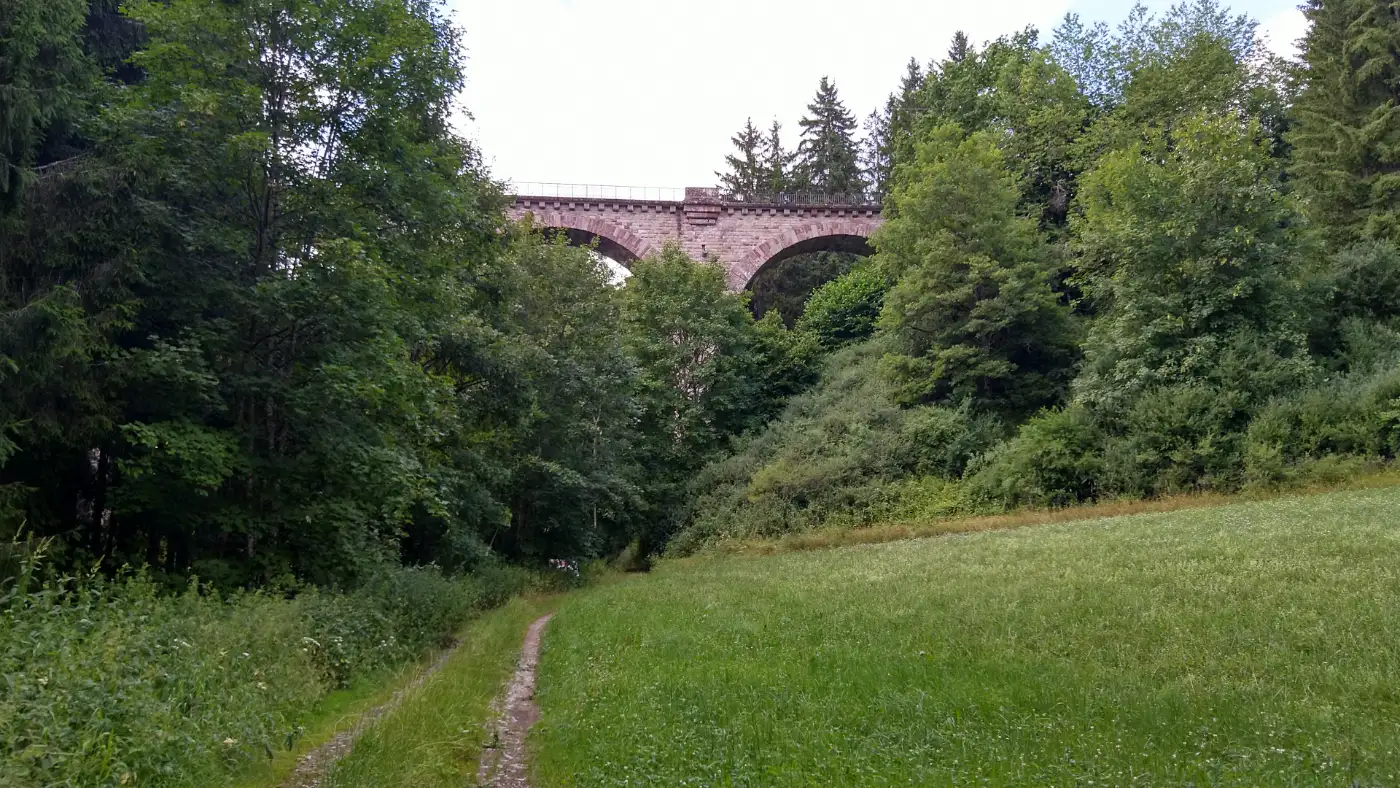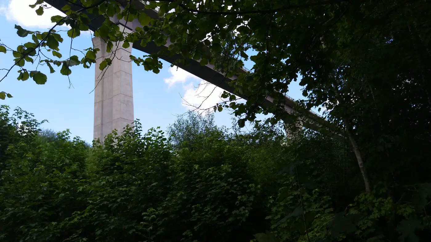 Das nächste Highlight lässt nicht lange auf sich warten: Ein rund 100 Meter langer, schnurgerader Wegtunnel erwartet uns - verborgen unterhalb der mächtigen Gauchachtalbrücke der B31. Dieser ungewöhnliche Durchgang wurde für den Wasserlauf der Mauchach geschaffen und zugleich für Wanderer begehbar gemacht. Während wir in den Tunnel eintreten, umfängt uns rasch die Dunkelheit - das Tageslicht schwindet mit jedem Schritt. Eine Taschenlampe oder Stirnlampe ist hier sehr zu empfehlen, um den Boden sicher zu erkennen und sich im feuchten, teils rutschigen Gang zu orientieren. Die Atmosphäre ist einmalig: kühl, still und leicht unheimlich - doch am Ende des Tunnels öffnet sich wieder der Blick in das Tal, und wir setzen unsere Tour mit frischer Spannung fort. Ein kleines Abenteuer mitten auf dem Wanderweg.