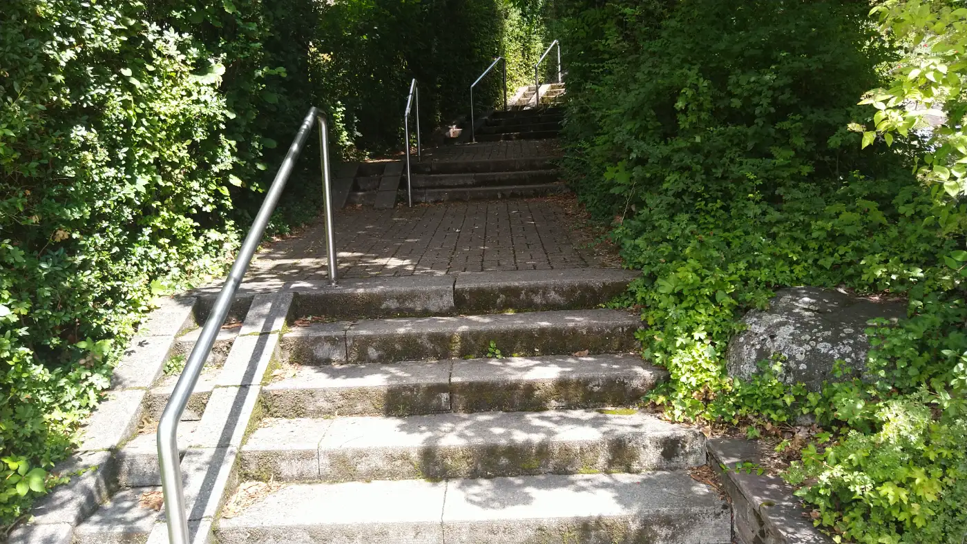 Nur wenige Schritte weiter erreichen wir die Martinskirche, deren markanter Turm das Stadtbild weithin prägt. Ihre Ursprünge reichen bis ins Mittelalter zurück, ehe sie über die Jahrhunderte hinweg mehrfach umgestaltet wurde. Wir verlassen den Kirchplatz, durchqueren den Park an der Bonifatiuskirche vorbei am Altar des Jupiters und dem Weltkriegsdenkmal, und steigen über den Treppenweg hinauf in die höher gelegenen Weinberge.Weinerlebnisweg