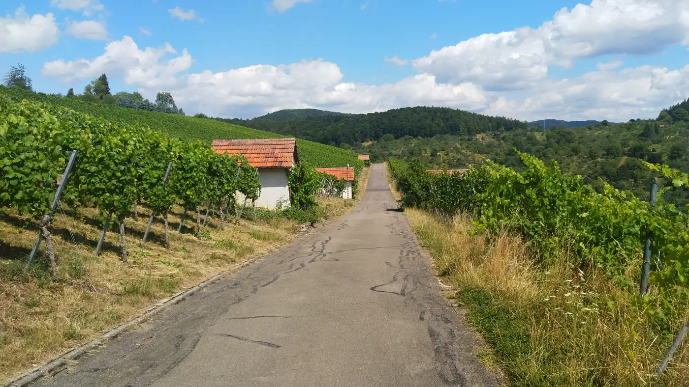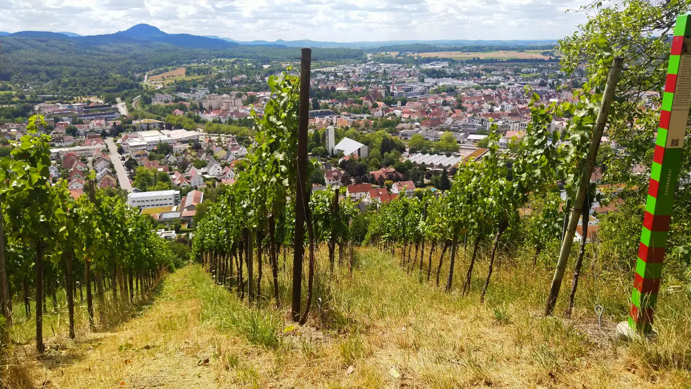 Zum Abschluss führt uns der Weg durch offene Streuobstwiesen zurück Richtung Stadt. Alte Obstbäume prägen die Landschaft und verleihen ihr einen ländlichen Charakter. Wir wandern entspannt weiter, begleitet von weitem Blick und ruhiger Umgebung. Hier endet unsere Wanderung, die Weinbau, Stadtgeschichte und Natur auf harmonische Weise miteinander verbindet.Diese Tour wurde am 17.07.2025 von einer realen Person erwandert, fotografiert und beschrieben. Die GPS-Daten der Fotos wurden vor Ort erfasst und dienten zur exakten Rekonstruktion der Route.
