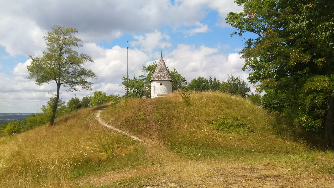 Unser Weg bringt uns hinauf zum Weinbergtürmle, dem höchsten Aussichtspunkt unserer Wanderung. Der kleine runde Turm wurde einst als Orientierungspunkt in den Weinbergen errichtet und diente Winzern sowie Wanderern gleichermaßen. Wir treten näher heran, lassen den Rundblick über Metzingen, die Rebhänge und das Albvorland auf uns wirken und spüren die besondere Ruhe, die diesen Ort fernab des Stadttrubels auszeichnet.Aussicht vom Weinberg
