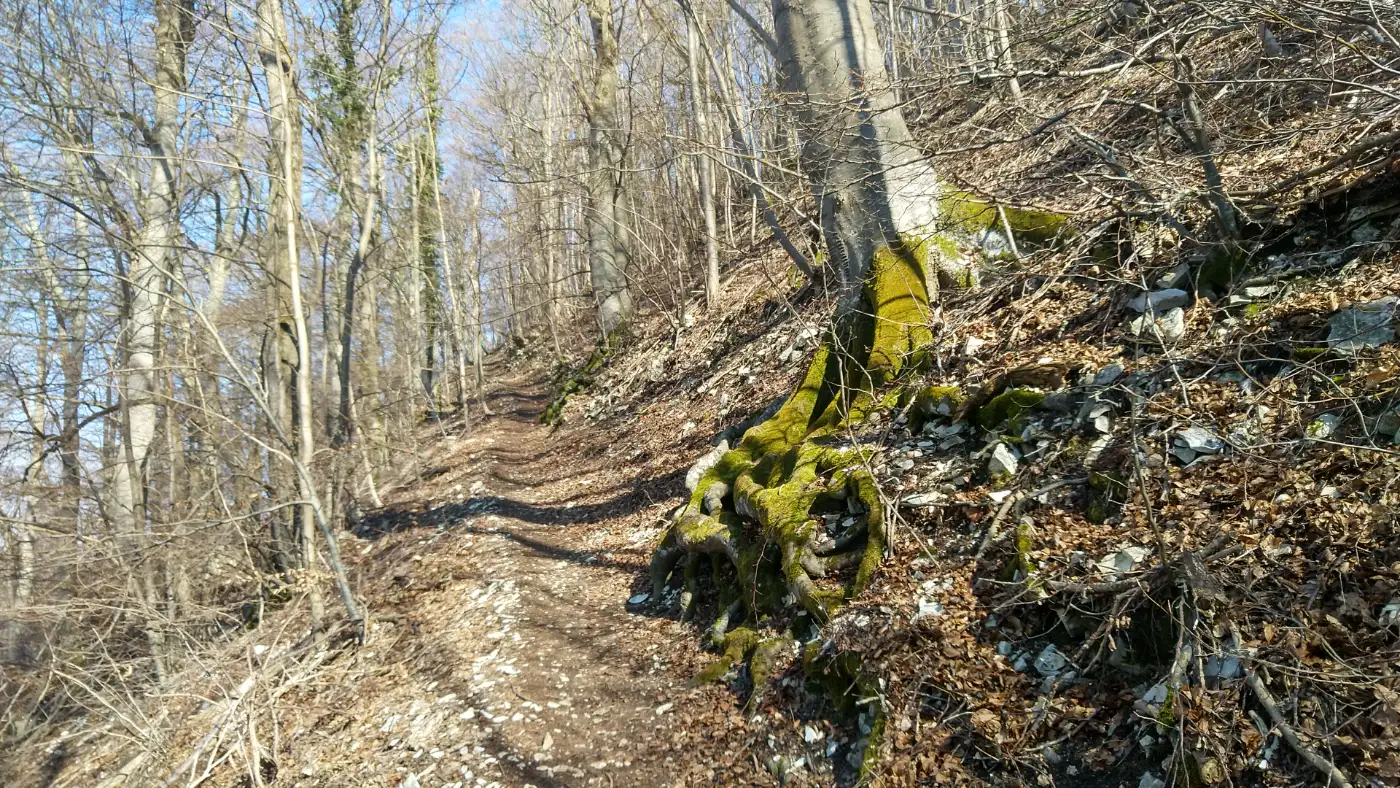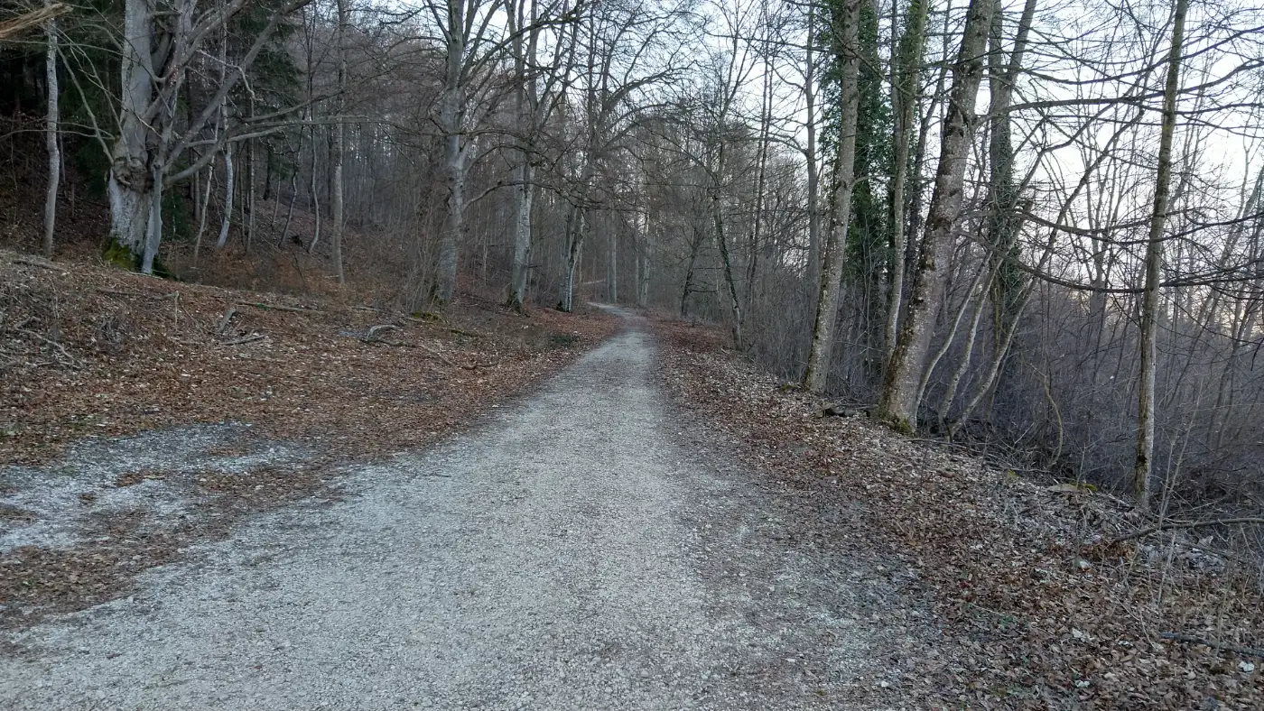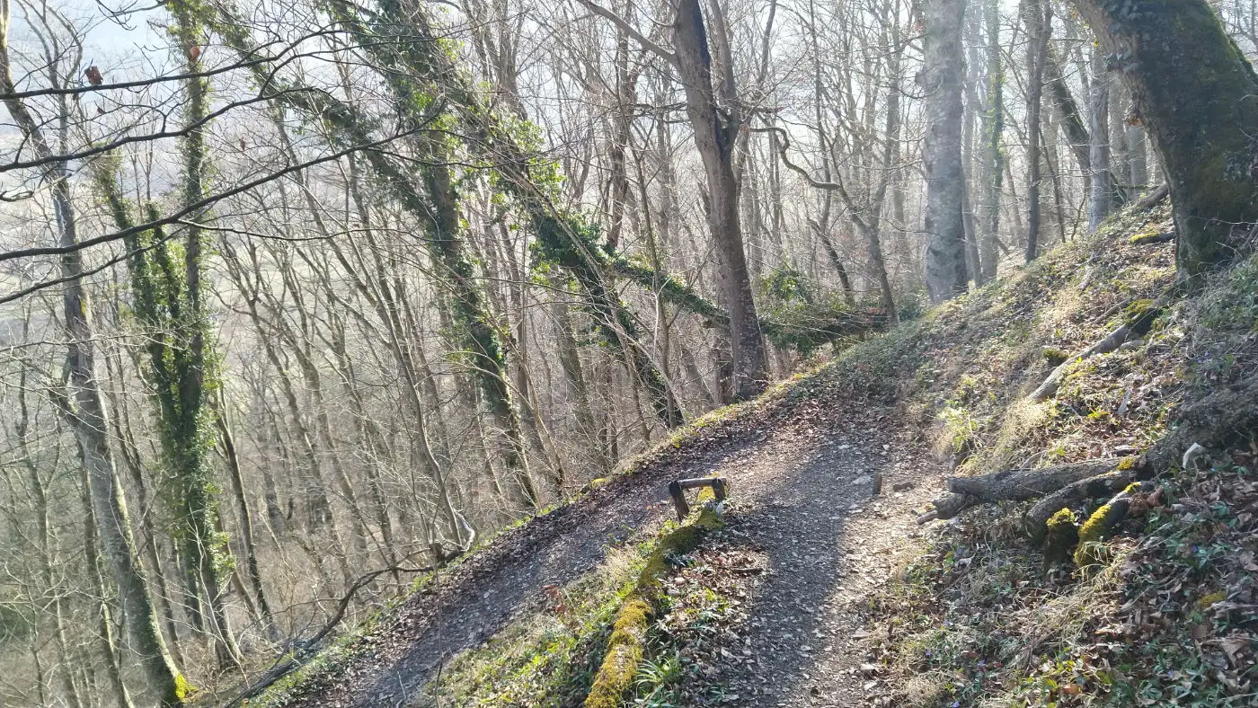Der Rückweg führt uns über die Ostseite des Farrenbergs. Auf dem historischen Ziegelrutschweg, einem schmalen Pfad mit gelegentlich schotterigem Untergrund, geht es in zahlreichen Serpentinen hinab ins Tal. Infotafeln erzählen die Geschichte dieses einstigen Transportwegs, auf dem früher Ziegel mit Schlitten zu Tal gebracht wurden. Wir folgen dem Weg durch kleinere Wiesenflächen und lichten Wald zurück in den Ort Mössingen, wo unsere Rundwanderung nach rund 12 km und etwa 550 Höhenmetern wieder am Bahnhof endet.Diese Tour wurde am 08.03.2025 von einer realen Person erwandert, fotografiert und beschrieben. Die GPS-Daten der Fotos wurden vor Ort erfasst und dienten zur exakten Rekonstruktion der Route.
