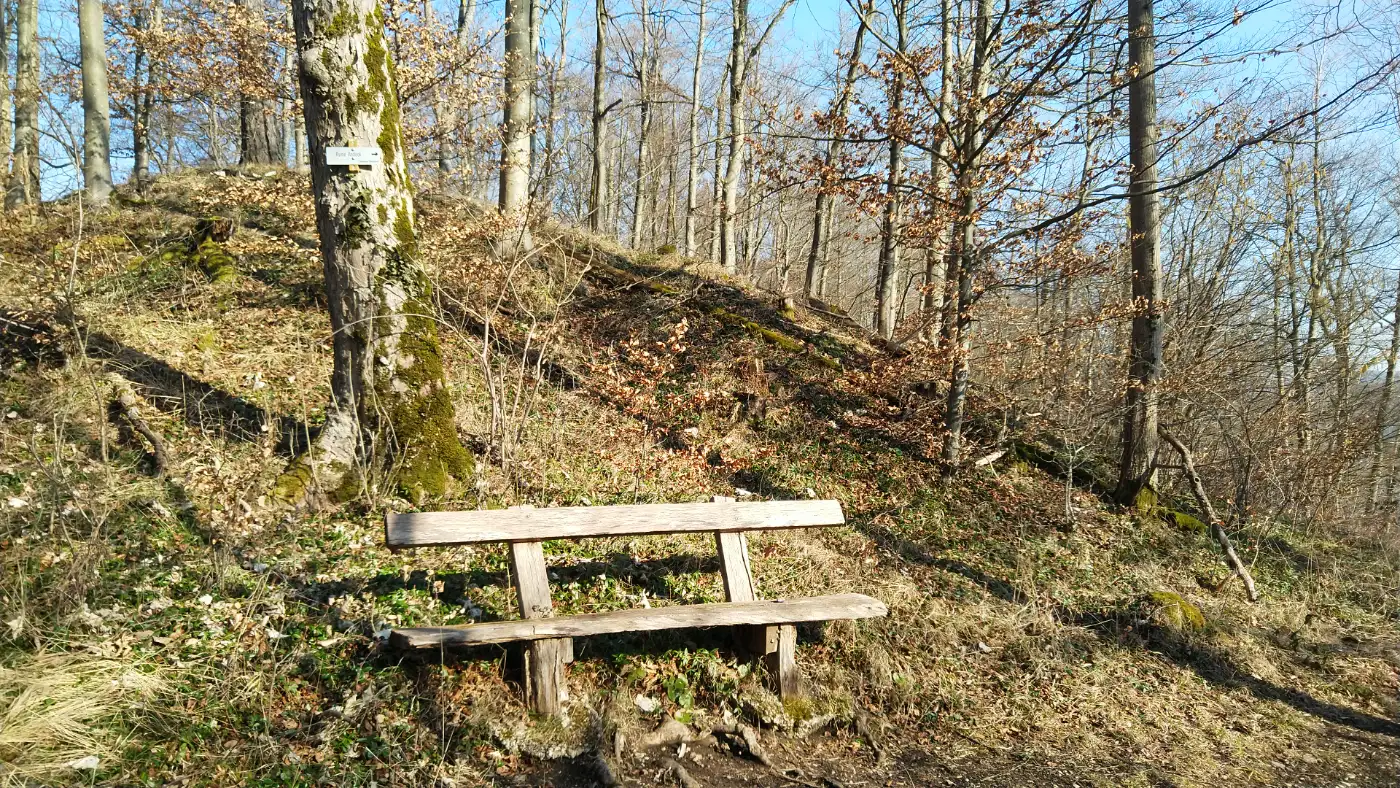 Entlang des Randes der Hochfläche wandern wir weiter zur Burgruine Andeck, die etwas abseits des Hauptwegs auf einem Felsvorsprung liegt. Die einstige Höhenburg stammt vermutlich aus dem 12. Jahrhundert und diente dem Schutz wichtiger Verkehrswege entlang des Albtraufs. Heute sind noch Teile der Ringmauer, Fundamentreste und Gräben sichtbar. Eine moderne Schutzhütte mit Bänken lädt zur Rast ein. Der Aussichtspunkt südlich der Ruine bietet einen beeindruckenden Blick über das Steinlachtal und ins Eyachtal, bis hinüber nach Talheim.Zurück nach Mössingen