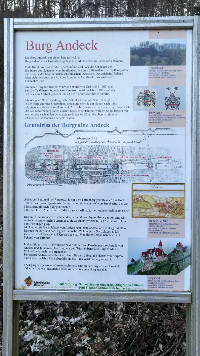 Der Weg führt nun weiter hinauf auf den Farrenberg. Hier betreten wir das weitläufige Segelfluggelände, das sich wie ein Hochplateau über dem Albtrauf erstreckt. Die große Wiese dient als Start- und Landebahn - besonders an Wochenenden kann man hier Segelfliegern beim lautlosen Gleiten zusehen. Die Thermik am Albtrauf gilt unter Piloten als besonders günstig.Burgruine Andeck