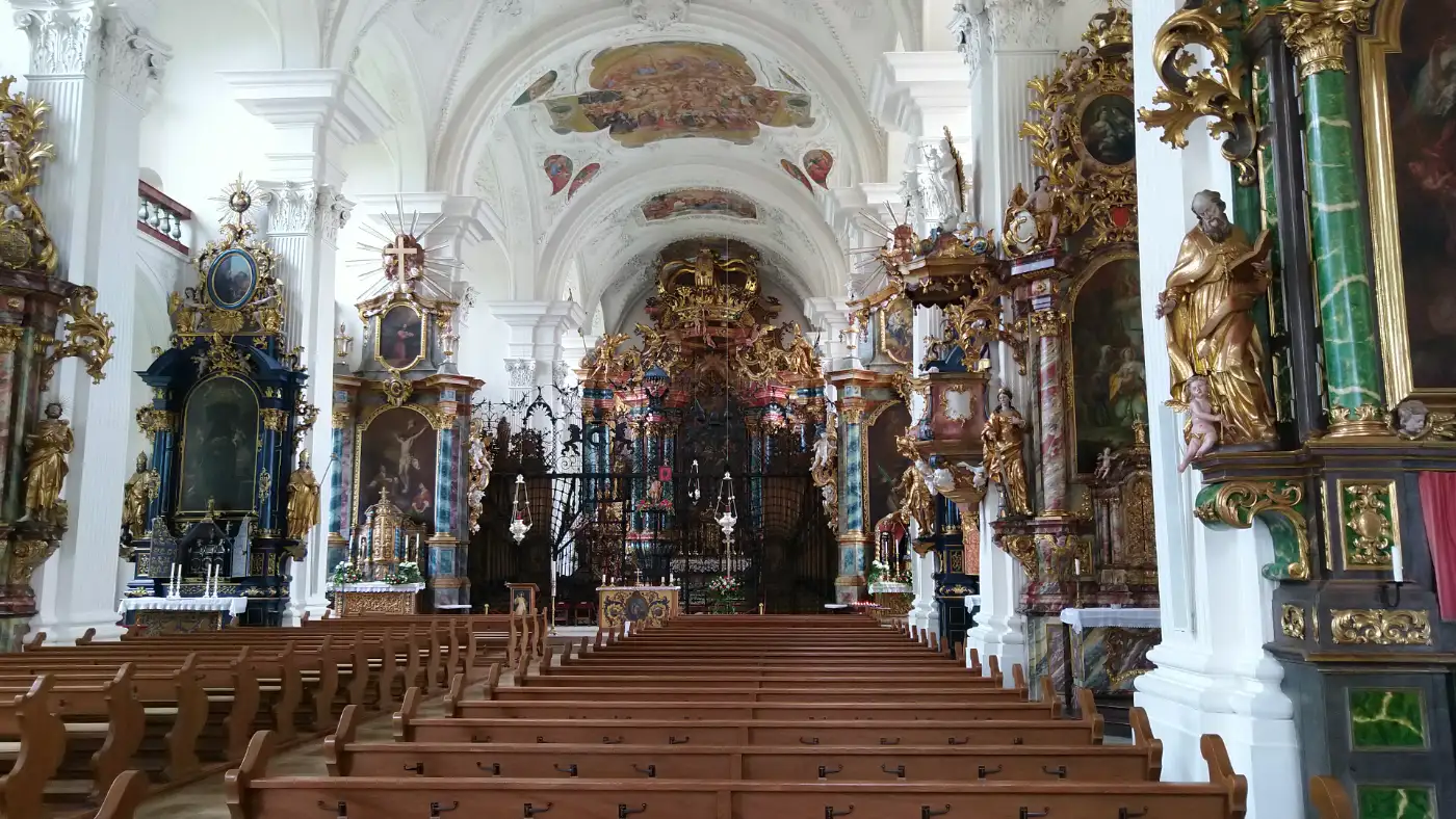 Das Kloster Rheinau wurde der Legende nach um 778 gegründet und entwickelte sich im 9. Jahrhundert zu einer bedeutenden Benediktinerabtei. Die prächtige Klosterkirche Mariä Himmelfahrt, beeindruckt mit ihrer siebenjochigen Wandpfeilerhalle und kunstvollen Seitenaltären.Sarkophag des heiligen Fintan