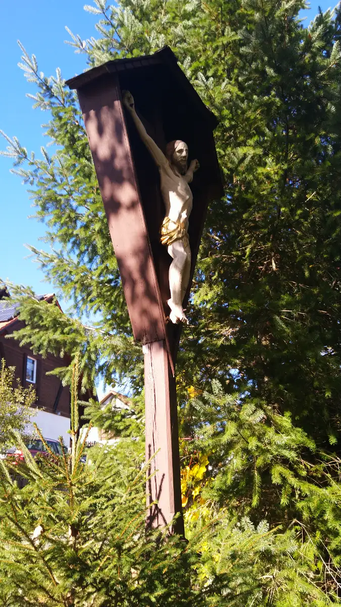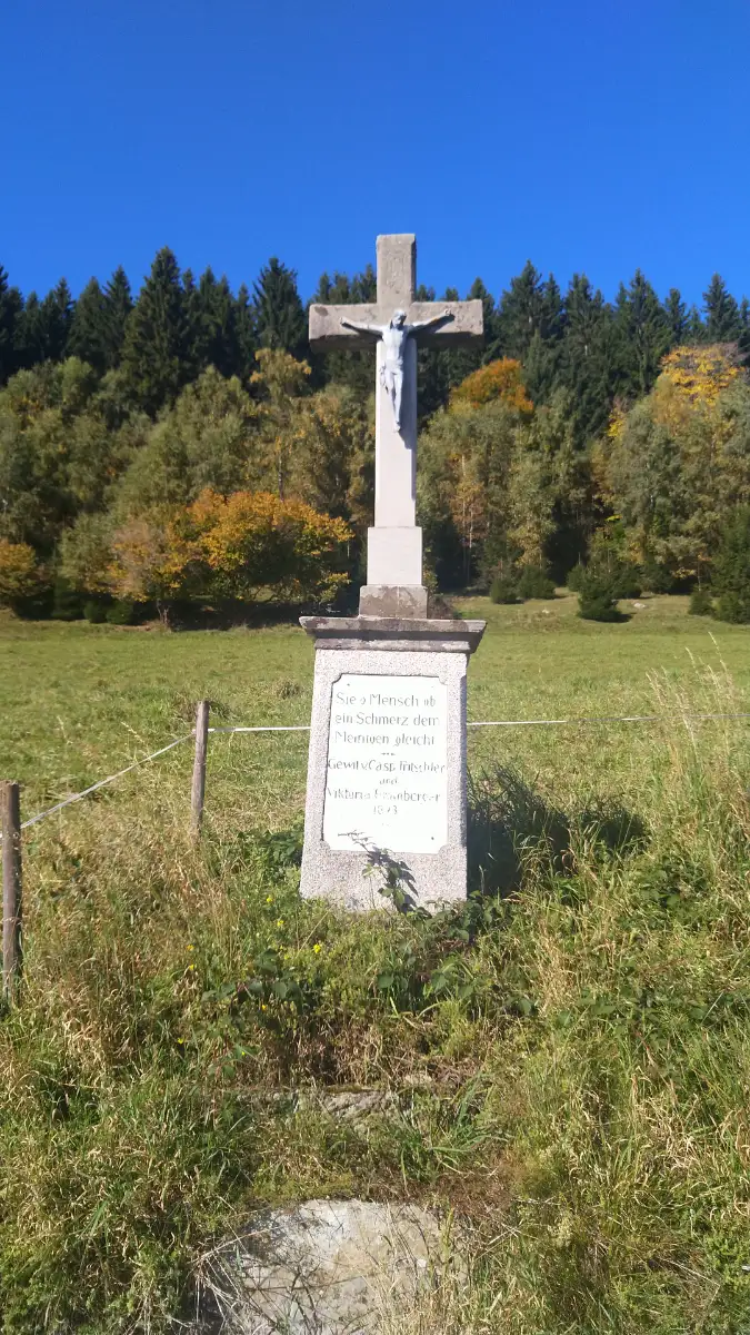 Über schmale Pfade erreichen wir das Kriegerdenkmal auf dem Fullberg, ein weithin sichtbares Holzkreuz mit Metallverankerung auf einer kleinen Lichtung oberhalb von Titisee-Neustadt. Es wurde in Gedenken an die Gefallenen der beiden Weltkriege errichtet und steht als schlichtes, aber kraftvolles Symbol des Friedens. Umgeben von alten Bäumen und stiller Natur bietet sich hier ein beeindruckender Panoramablick über das Gutachtal und die Höhen des Schwarzwalds. Wir verweilen einen Moment, lassen den Blick schweifen und spüren die stille Würde, die von diesem Ort ausgeht, bevor wir unseren Weg weiter fortsetzen.Schillingskapelle bei Friedenweiler