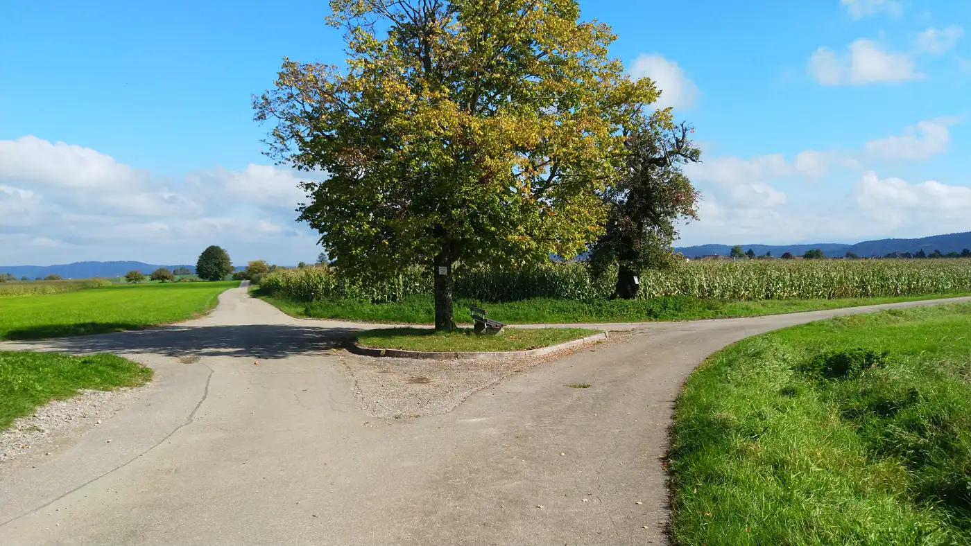 Weiter führt unser Weg hinauf zum Bollerfels, von dem wir eine beeindruckende Sicht auf das Dorf Aistaig genießen. Von diesem Aussichtspunkt aus erkennen wir die Dächer, Felder und Wälder, die sich harmonisch ins Tal schmiegen. Wir lassen unseren Blick schweifen und spüren die Weite der Landschaft, während die Sonne die Umgebung in warmes Licht taucht. Der Bollerfels ist ein idealer Platz für eine kurze Rast und zum Fotografieren der Szenerie.Der Zankbaum - ein uralter Birnbaum