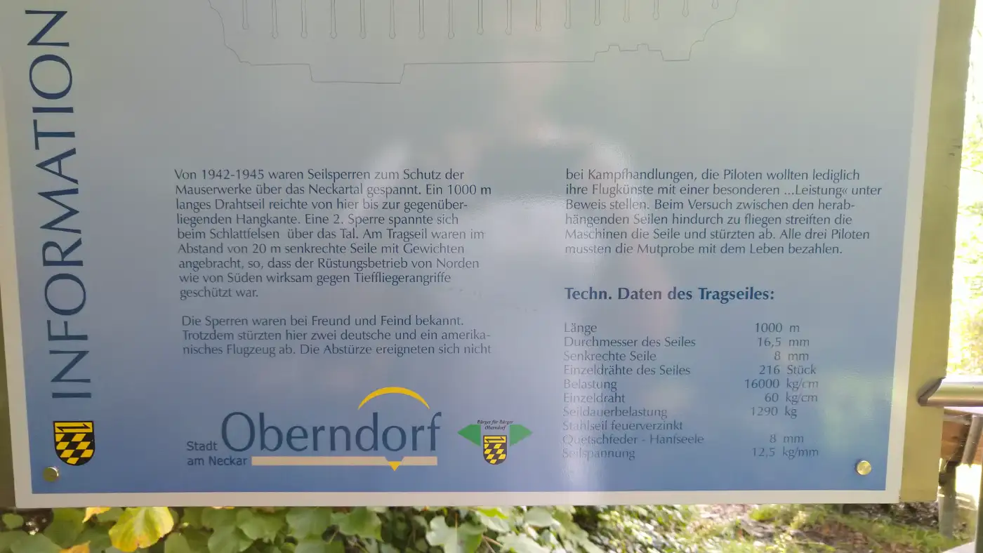 Heute sind nur noch die Fundamente der Pfosten erhalten, die einst die Sperrseile hielten. Eine Infotafel vor Ort informiert über die technische Ausführung und die historische Bedeutung dieser Anlage. Der Ort lädt zum Innehalten und Nachdenken ein und bietet einen eindrucksvollen Ausblick auf das Neckartal und die umliegende Landschaft.