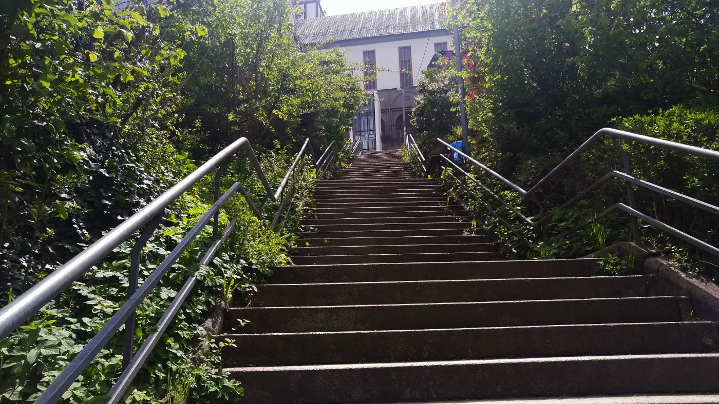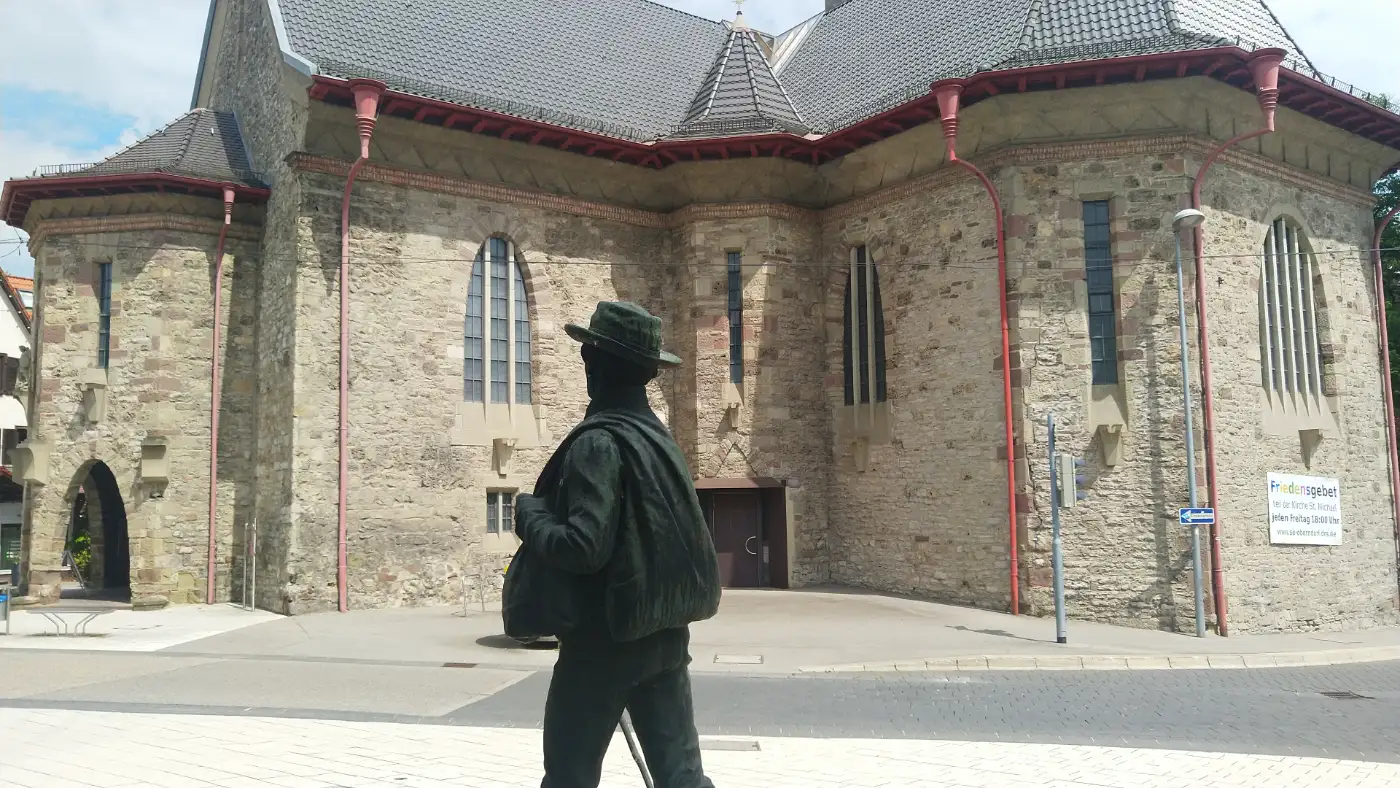 Startpunkt der Route ist Oberndorf am Neckar - historisch, charmant und geprägt vom Fachwerk der Altstadt. Wir lassen das Bahnhofsgebäude hinter uns und machen uns auf den Weg in die Oberstadt. Auf Höhe der katholischen Kirche führt unser Weg geradeaus am Verlagshaus des Schwarzwälder Boten vorbei. Auf der gegenüberliegenden Straßenseite steigen wir die markanten Treppenstufen zur evangelischen Stadtkirche hinauf. Oben angekommen, biegen wir nach links ab und folgen der Straße weiter auf den Mühlberg.Aufstieg zum Mühlberg