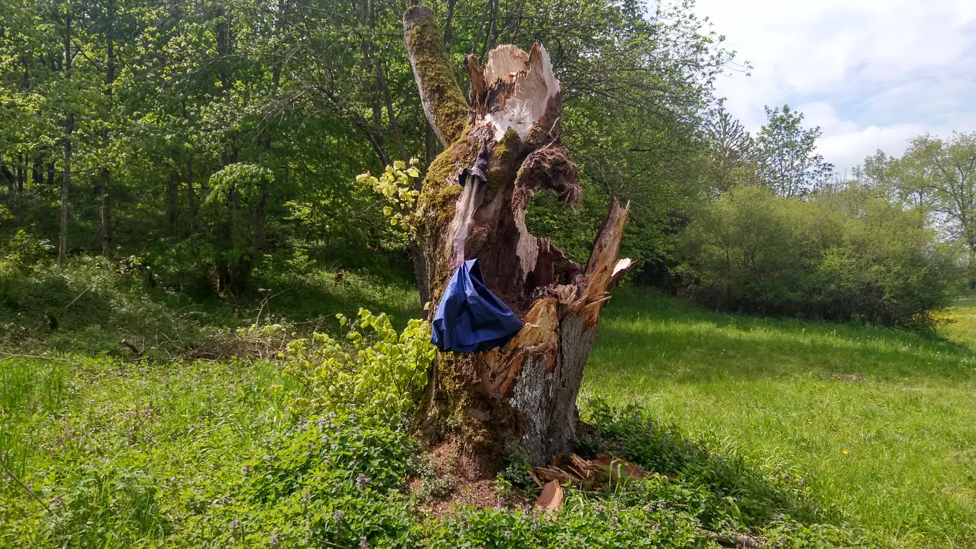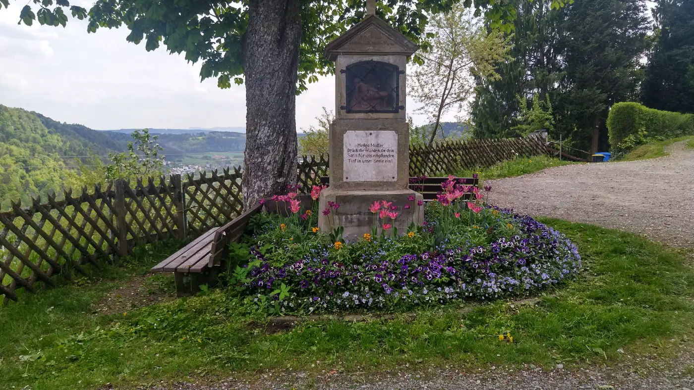 Wir folgen nun der Bösinger Steige, einem schmalen, kaum befahrenen asphaltierten Sträßchen, das sich in sanften Kurven bergauf durch den Wald schlängelt. Mit jedem Schritt wird es stiller - nur das Zwitschern der Vögel und das Rascheln der Blätter begleiten uns auf unserem Weg. Schließlich erreichen wir den traditionsreichen Gasthof Stockbrunnen, idyllisch am Waldrand gelegen. Hier biegen wir links ab und setzen unsere Wanderung fort - weiterhin auf Asphalt, doch nun begleitet von offener Landschaft: weite Felder, blumige Wiesen und der Blick in die Ferne lassen uns tief durchatmen. Der Weg führt nun in leichtem Auf und Ab dahin, vorbei an saftigem Grün und unter weitem Himmel.Kruzifix zwischen zwei riesigen Eichen