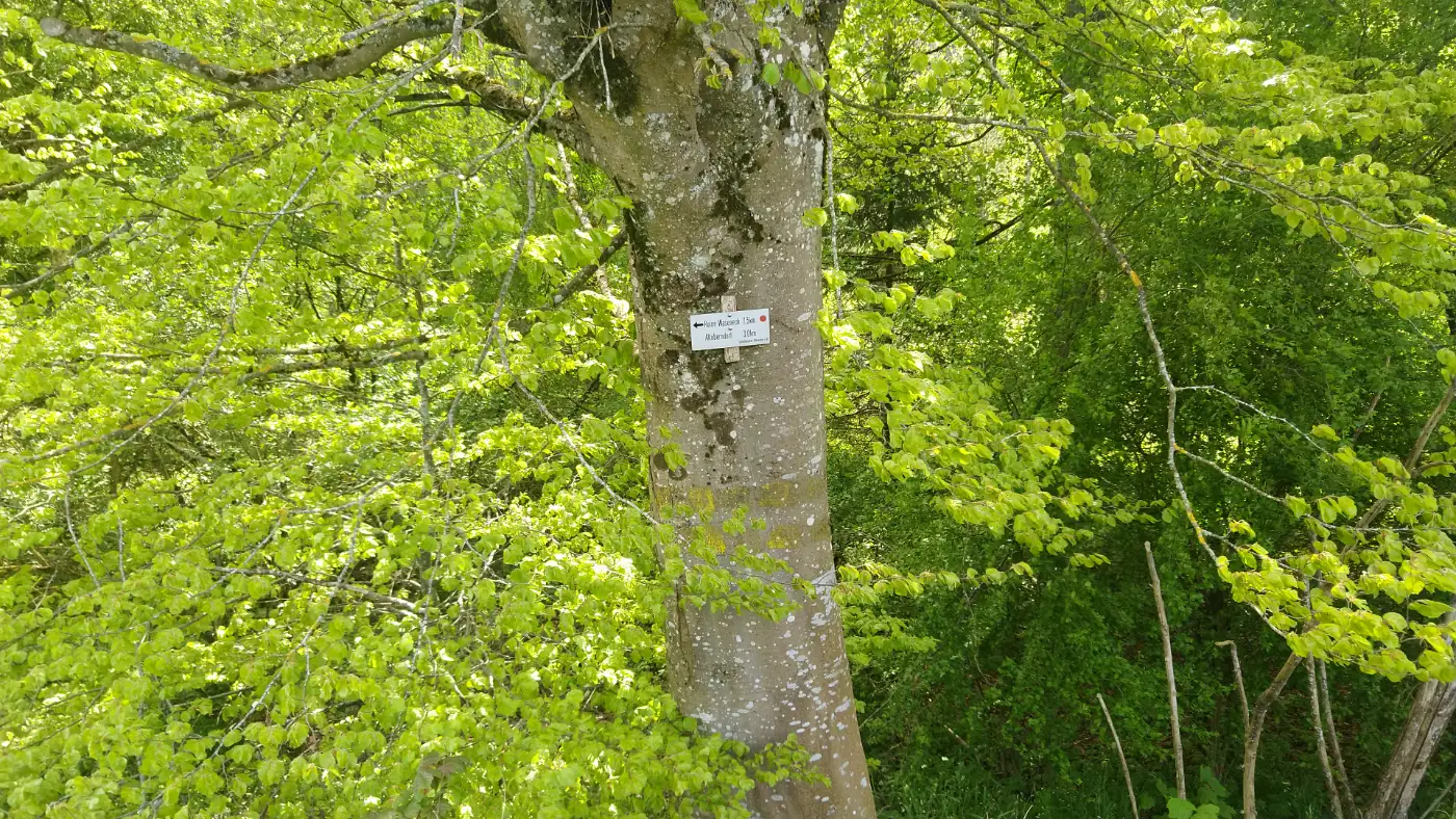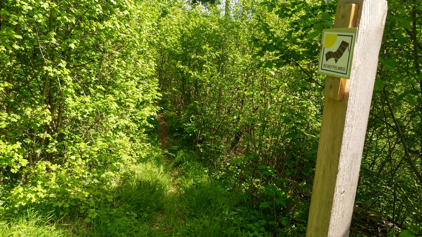 Von der Burg führt ein schmaler Pfad durch den Wald hinunter nach Altoberndorf. Ein Wegweiser mit der Aufschrift Scheffelweg hilft uns, den richtigen Abzweig zu finden. In Altoberndorf besteht die Möglichkeit, mit dem Bus bequem zurück nach Oberndorf zu fahren."Diese Tour wurde am 07.05.2025 von einer realen Person erwandert, fotografiert und beschrieben. Die GPS-Daten der Fotos wurden vor Ort erfasst und dienten zur exakten Rekonstruktion der Route.