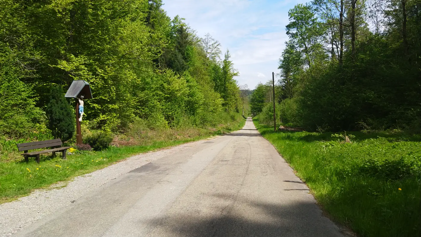 Nach einiger Zeit stoßen wir auf einen ganz besonderen Ort: Zwei mächtige, nebeneinanderstehende Eichenriesen, deren ausladende Kronen sich fast berühren. Zwischen ihnen steht ein zwei Meter hohes hölzernes Kruzifix, das von einer schlichten Holzbank flankiert wird. Ein Platz, der Ruhe ausstrahlt - fast wie eine natürliche Kapelle unter freiem Himmel. Hier lohnt es sich, eine Pause einzulegen, zu verweilen und den Moment zu genießen.Waldweg und mystische Schlucht