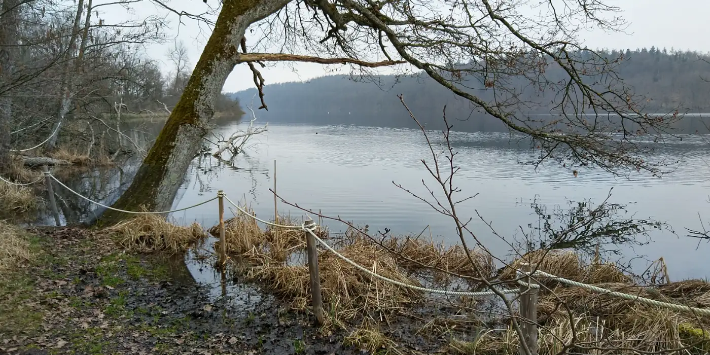Dem Wegweiser zum Mindelsee folgend unterqueren wir die B33, bis sich nach und nach das Naturschutzgebiet rund um den Mindelsee vor uns öffnet. Der etwa 115 Hektar große, eiszeitlich entstandene See gehört zu den ältesten Naturschutzgebieten Baden-Württembergs und steht bereits seit 1938 unter besonderem Schutz. Auf schmalen Pfaden durchqueren wir Feuchtwiesen und lichte Uferbereiche. Das Wasser liegt ruhig zwischen dichten Schilfgürteln und bietet zahlreichen Vogelarten sowie seltenen Pflanzen einen geschützten Lebensraum.Blick auf Liggeringen