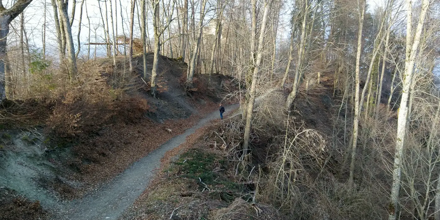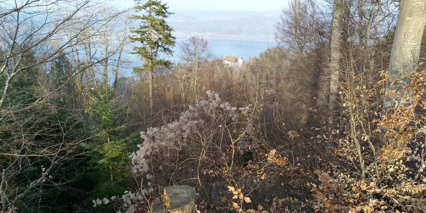 Aussichtsreiche Wanderung mit historischen Burgruinen, idyllischem Naturschutzgebiet, charmanten Ortschaften und satirischer Kunst am Wasser. Wir beginnen unsere Wanderung am Bahnhof von Radolfzell am Bodensee und gehen durch die Innenstadt, vorbei am Kaufland und dem Seemax, bevor wir über Haselbrunn hinauf in Richtung Radolfzeller Waldfriedhof wandern. Hinter dem Friedhof erreichen wir das Gelände des ehemaligen Schießstandes der SS Radolfzell. Zwischen Bäumen verborgen liegt heute ein Ort, der während der Zeit des Nationalsozialismus als Ausbildungs- und Übungsstätte diente. Angehörige der SS-Einheit Radolfzell nutzten das Areal für Schießübungen; zugleich steht der Standort im Zusammenhang mit der Geschichte des nahegelegenen KZ-Außenlagers. Informationstafeln vor Ort ordnen die historische Bedeutung ein und machen deutlich, welche Rolle dieser Platz einst spielte.Am Mindelsee