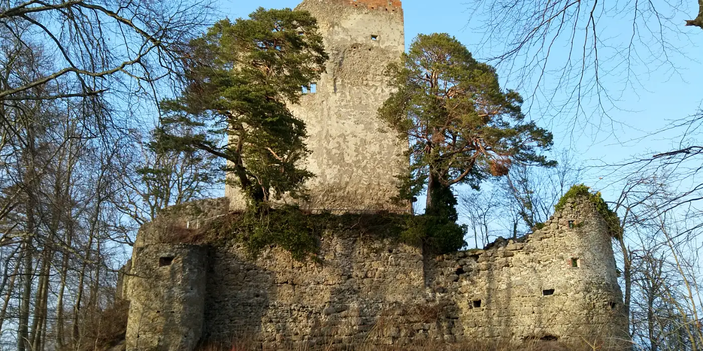 Unsere Route nach Bodman führt uns über die Höhen des Bodanrücks. Zunächst steigen wir hinauf zum Wolfsgrund, queren anschließend das Mühlbachtal, lassen den Lützelhart links liegen und bewegen uns Schritt für Schritt auf Liggeringen zu. Der Wechsel aus Anstieg und leichtem Gefälle verleiht diesem Abschnitt einen abwechslungsreichen Rhythmus. Am Wolfsgrund angekommen öffnet sich vor uns das Panorama: Liggeringen liegt aussichtsreich auf der Hochfläche und gehört als Ortsteil zu Radolfzell am Bodensee. Umgeben von Streuobstwiesen, Äckern und sanft geschwungenen Geländelinien wirkt der Ort wie auf eine natürliche Aussichtsterrasse gesetzt.Ruine Altbodman