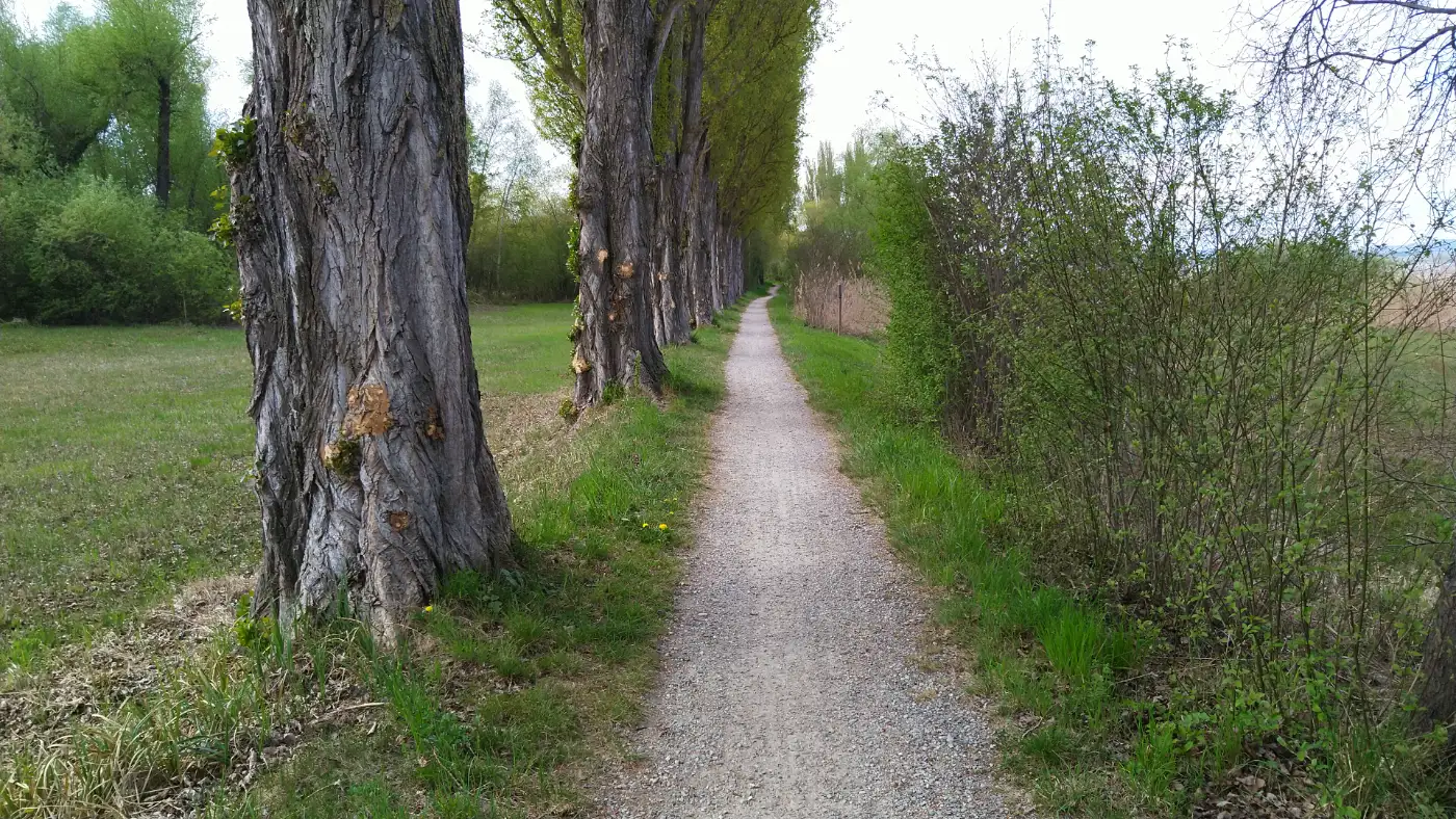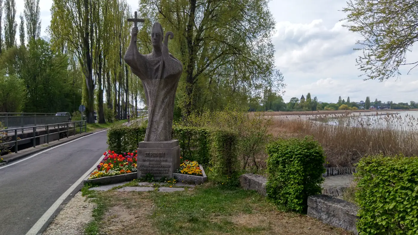 Unsere Wanderung beginnt am Bahnhof Reichenau (Ortsteil Reichenau-Waldsiedlung), den wir in Richtung Markthalle verlassen. Vorbei am nahegelegenen Lidl-Markt, überqueren wir die B33 auf einer Brücke und folgen der Pirminstraße - einer von alten, knorrigen Weidenbäumen gesäumten Allee. Diese historische Verbindung führt schnurgerade über den Damm, der seit dem 19. Jahrhundert die Insel Reichenau mit dem Festland verbindet.Statue des heiligen Pirmin