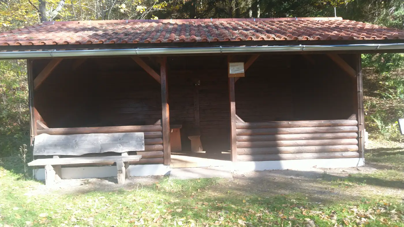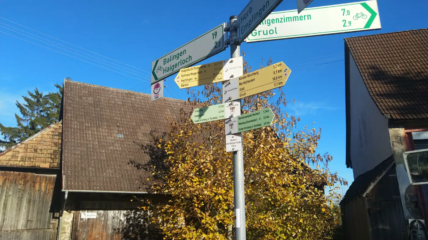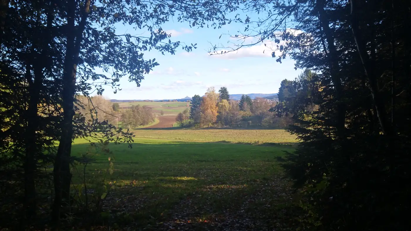 Stimmungsvolle Wanderroute mit historischen Bauwerken, stillen Wald- und Wiesenwegen sowie beeindruckenden Ausblicken bis zur Altstadt von Haigerloch. Wir beginnen unsere Wanderung im beschaulichen Renfrizhausen, einem Ortsteil der Stadt Sulz am Neckar, eingebettet im idyllischen Mühlbachtal zwischen Nordschwarzwald, Schwäbischer Alb und Neckartal. Enge Gassen, liebevoll gepflegte Fachwerkhäuser und die ruhige Lage im Tal schaffen eine Atmosphäre der Entschleunigung. Von hier folgen wir einem sanft ansteigenden Weg, der uns hinaus aus dem Dorf und hinein in die offene Landschaft führt. Bereits nach wenigen Schritten liegen die Dächer Renfrizhausens hinter uns - wir tauchen ein in das Grün der Wiesen und Felder.Holzkreuz auf einem Hügel
