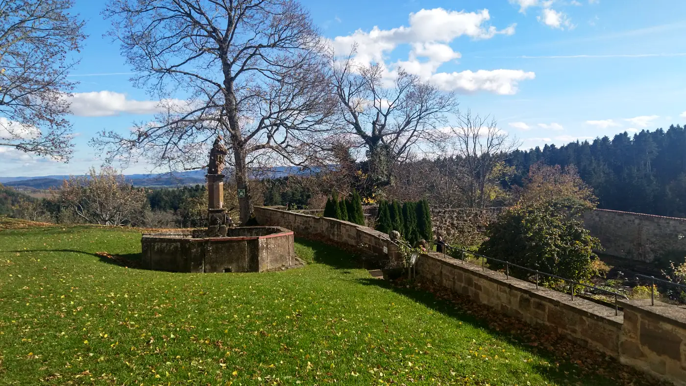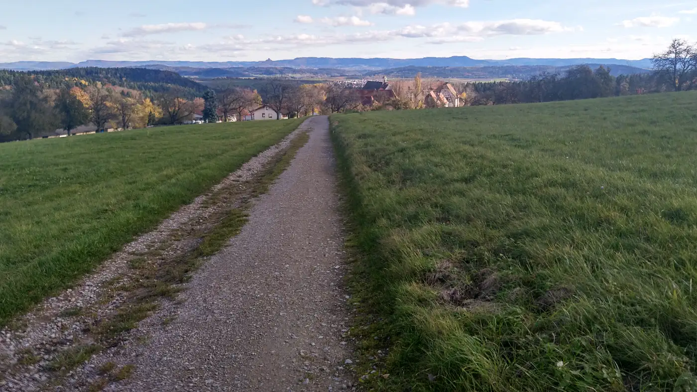 Etwas abseits des Hauptgebäudes liegt der Klosterfriedhof, umgeben von alten Bäumen und einer niedrigen Steinmauer. Der Klosterfriedhof und der angrenzende Kräutergarten laden zu einem ruhigen Rundgang ein, und vom Gelände eröffnen sich schöne Blicke etwa zum Hohenzollern — ein passender Ort für eine Rast und zum Innehalten. Wir gehen den schmalen Pfad entlang, vorbei an schlichten Grabkreuzen, die von der Bescheidenheit und Hingabe der früheren Bewohnerinnen zeugen. Der Ort strahlt eine stille Würde aus, die uns unwillkürlich langsamer gehen lässt. Hier verweilen wir kurz, bevor wir unseren Weg fortsetzen.Wanderweg nach Haigerloch