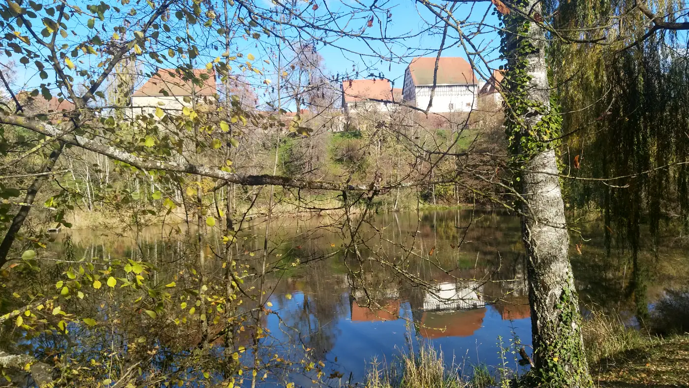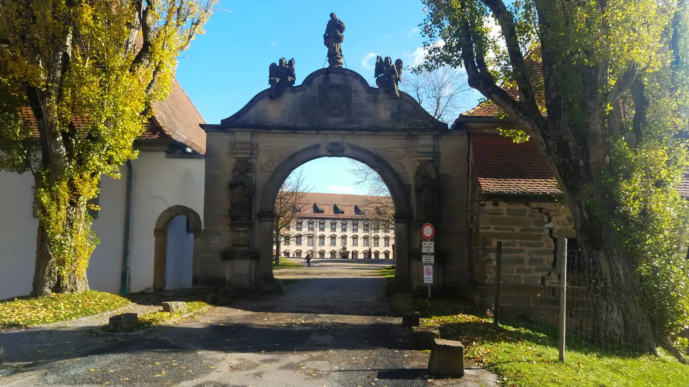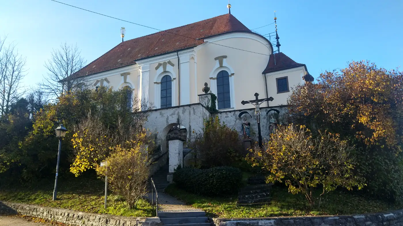 Bald erreichen wir einen kleinen Hügel unweit des Klosters Kirchberg, auf dessen Kuppe ein markantes Holzkreuz steht. In manchen Quellen wird es als Caravaca-Kreuz oder schlicht als Gipfelkreuz bezeichnet; der Name geht nicht - wie oft vermutet - auf die spanischen Worte für "Kuhgesicht" zurück, sondern auf die Stadt Caravaca de la Cruz, wo diese doppelarmige Kreuzform ihren Ursprung hat. Von hier aus öffnet sich ein weiter Blick über das Tal und auf die sanften Höhenzüge der Schwäbischen Alb. Wir halten inne und genießen die Stille, die nur vom leisen Rauschen des Windes begleitet wird. Das Kreuz wirkt wie ein stiller Wegweiser und stimmt uns auf das nächste Ziel ein - das Kloster Kirchberg.Ehemaliges Kloster Kirchberg