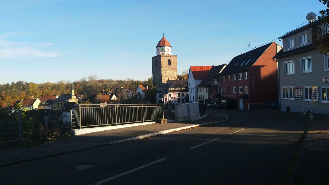 Vom Kloster aus führt uns ein gut markierter Wanderweg durch sanft hügeliges Gelände weiter in Richtung Haigerloch. Wir folgen Feldwegen, die von Hecken und Streuobstwiesen gesäumt sind, und genießen immer wieder herrliche Ausblicke über das Eyachtal. Der Pfad schlängelt sich durch lichte Wälder, kreuzt kleine Bäche und führt schließlich hinab in das Tal, in dem Haigerloch liegt. Mit jedem Schritt nähern wir uns der Stadt, die malerisch auf mehreren Ebenen in den Felsen gebaut ist.Römerturm in Haigerloch