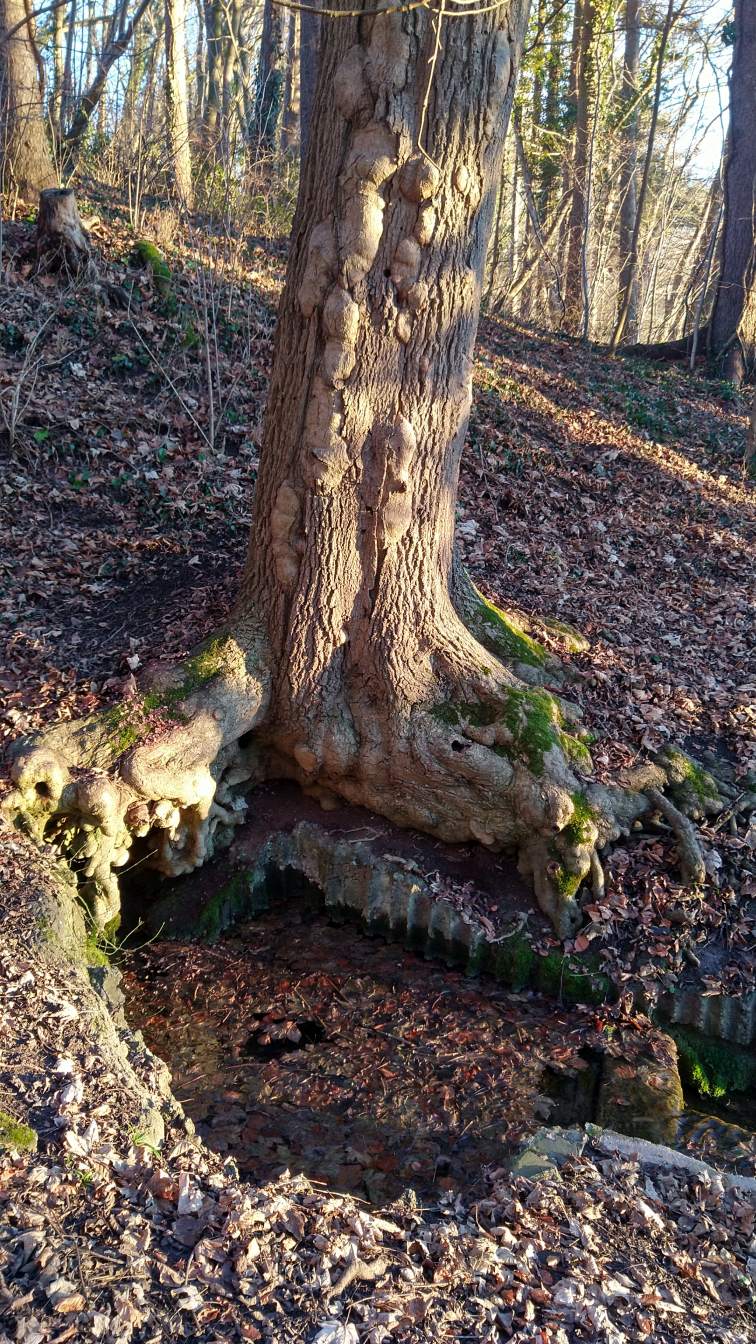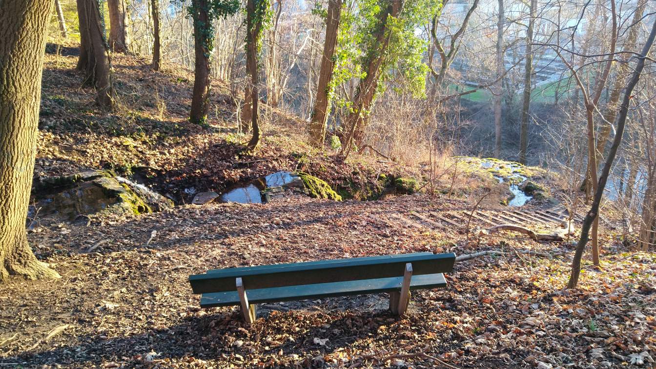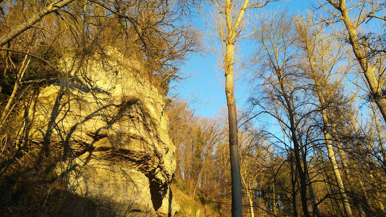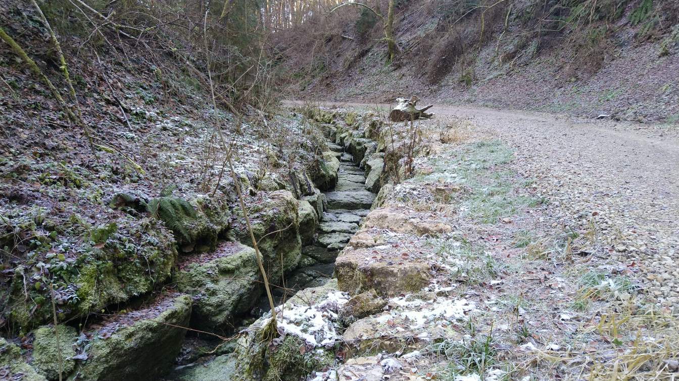 Nach unserem Aufenthalt am Turm setzen wir die Wanderung fort in Richtung Höllenstein, einem kleinen, aber markanten Höhenzug, der nordöstlich von Rottweil liegt. Der Weg führt über den Höllensteinsaumpfad, ein schmaler Wanderpfad, der teils steil, aber landschaftlich sehr reizvoll ist. Über zahlreiche Trittstufen und Holztreppen erklimmen wir den Felsen, der umgeben ist von Buchen- und Mischwald. Immer wieder öffnen sich kleine Lichtungen mit wunderbaren Ausblicken auf das Neckartal und die Umgebung.Höllensteinquelle