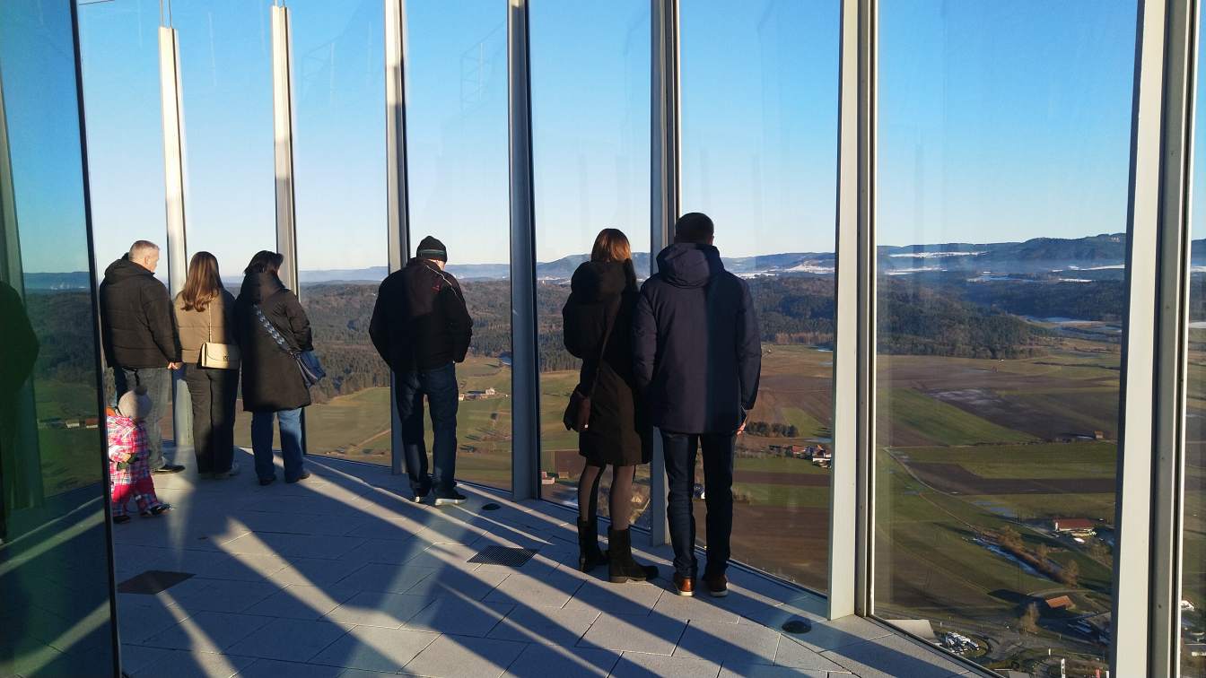 Oben angekommen, genießen wir den Weitblick und erfahren auf Infotafeln mehr über das Testzentrum, die verwendete Technik und die Bedeutung des Turms für die Zukunft der urbanen Mobilität.Höllensteinsaumpfad