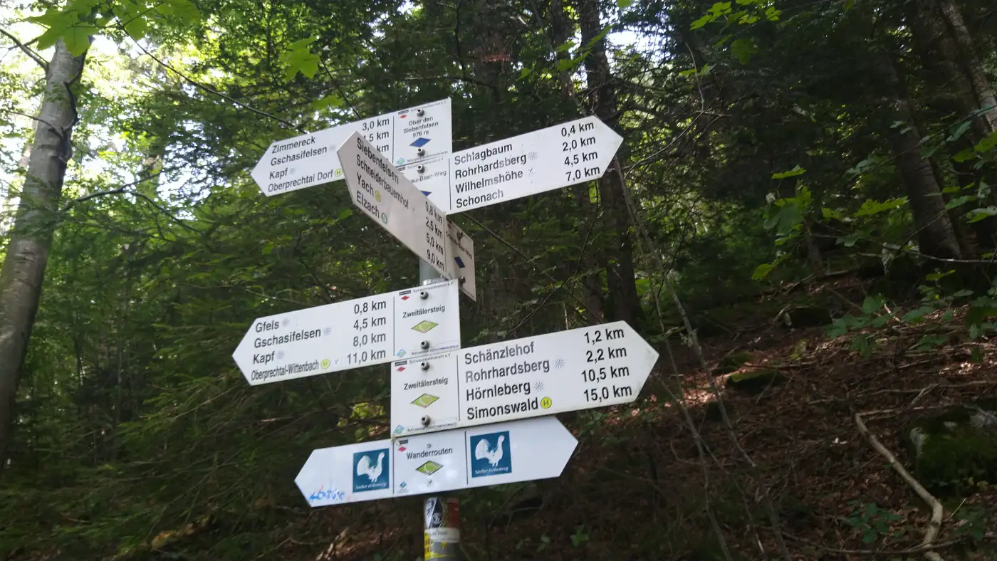 In der Gschasikopfhütte entdecken wir das Gipfelbuch, in das wir uns mit Freude eintragen. Zwischen den Seiten finden wir die Einträge vieler Wanderer, die vor uns hier standen und ihre Eindrücke hinterlassen haben. Es ist ein kleines Ritual, das uns mit all jenen verbindet, die diesen besonderen Ort besucht haben. Da wir von Schonach heraufgekommen sind, erscheint der Anstieg überraschend leicht - nur wenige Höhenmeter trennen uns vom Felsen. Umso mehr wundern wir uns, warum hier überhaupt ein Gipfelbuch liegt. Doch schon bald wird uns klar: Der Abstieg nach Elzach verlangt uns fast 700 Höhenmeter ab und zeigt eindrucksvoll, dass dieser Platz durchaus Gipfelcharakter besitzt.Elzach