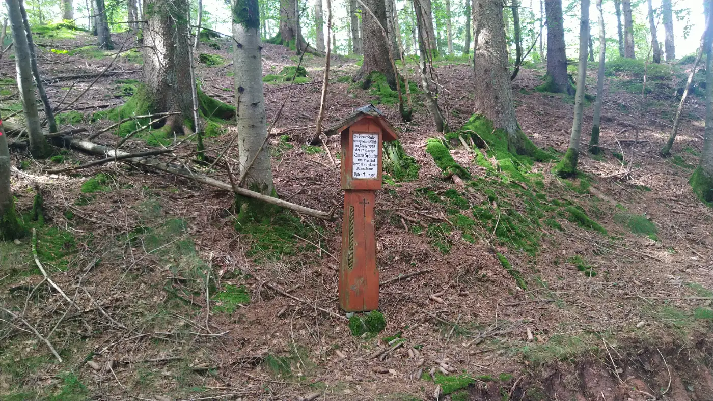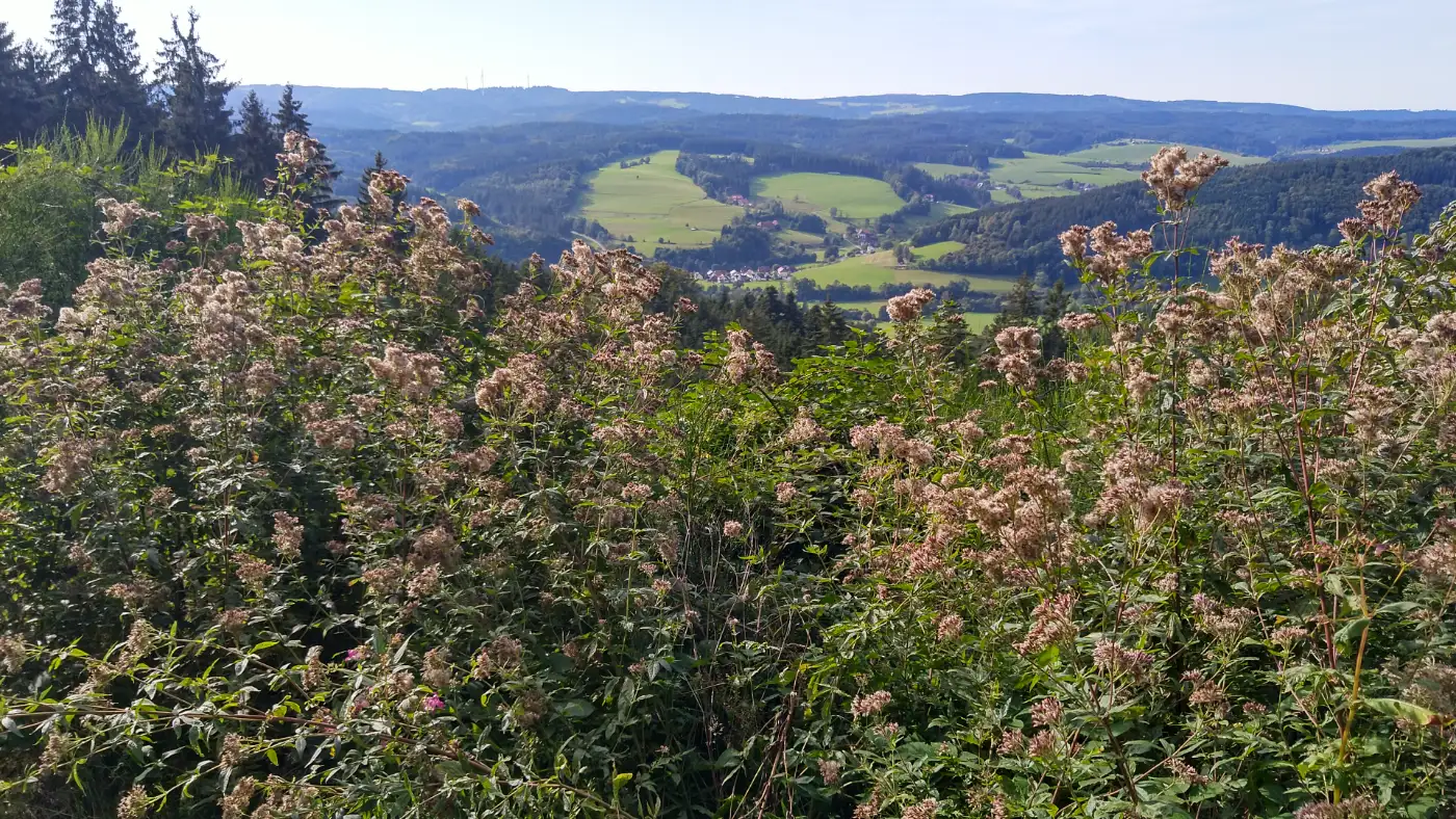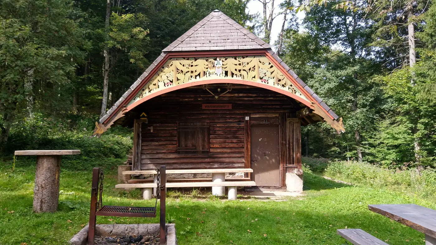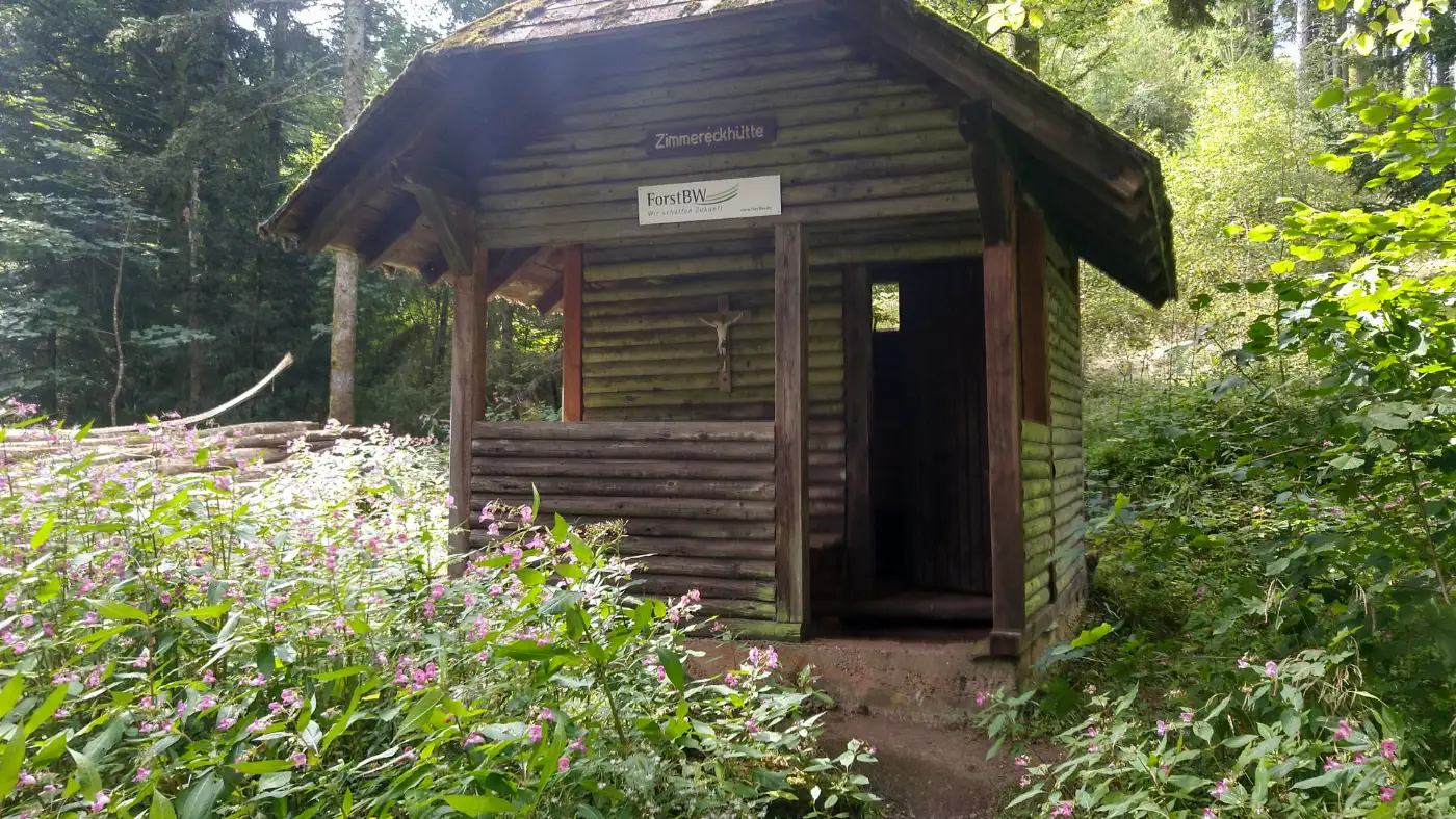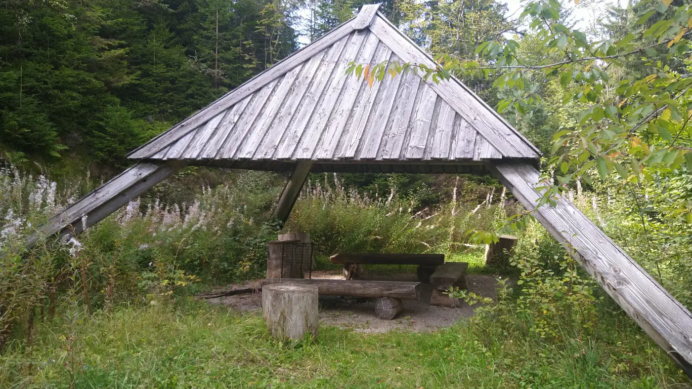 Nach einigen weiteren Kilometern erreichen wir die Gschasikopfhütte - den Höhepunkt unserer Wanderung. Sie liegt idyllisch im Wald, nur etwa drei Meter neben dem Felsenabgrund, und lädt uns zum Rasten ein. Die einfache, aber gemütliche Schutzhütte bietet Schutz vor Wind oder Regen und eignet sich perfekt für eine kleine Stärkung. Hier atmen wir tief durch, lauschen dem Zwitschern der Vögel und genießen den besonderen Moment, während wir die Aussicht und den anschließenden Abstieg nach Elzach erkunden.Gschasikopfhütte Aussicht