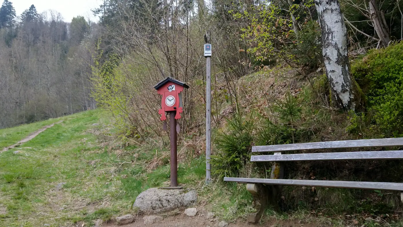 Nun kehren wir auf demselben schmalen Pfad zurück bis zur blauen Raute, deren Markierung wir diesmal bergauf folgen. Auf stetigem Anstieg gelangen wir wieder zum Schlagbaum, unserem bekannten Wegpunkt. Von hier führt uns der Weg hinab zum Ochsenhof und weiter bis zum Weiler Rohrhardsberg. Am Weiler Rohrhardsberg biegen wir rechts ab und folgen dem Uhrenpfad, der uns durch dichte Wälder das Elztal hinaufführt. Entlang des Pfades begleiten uns das Rauschen zahlreicher kleiner Wasserfälle und die kühle Frische des Waldes - ein stimmungsvolles Finale unserer Rundwanderung.Uhrenpfad im Elztal