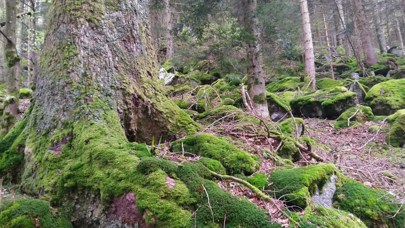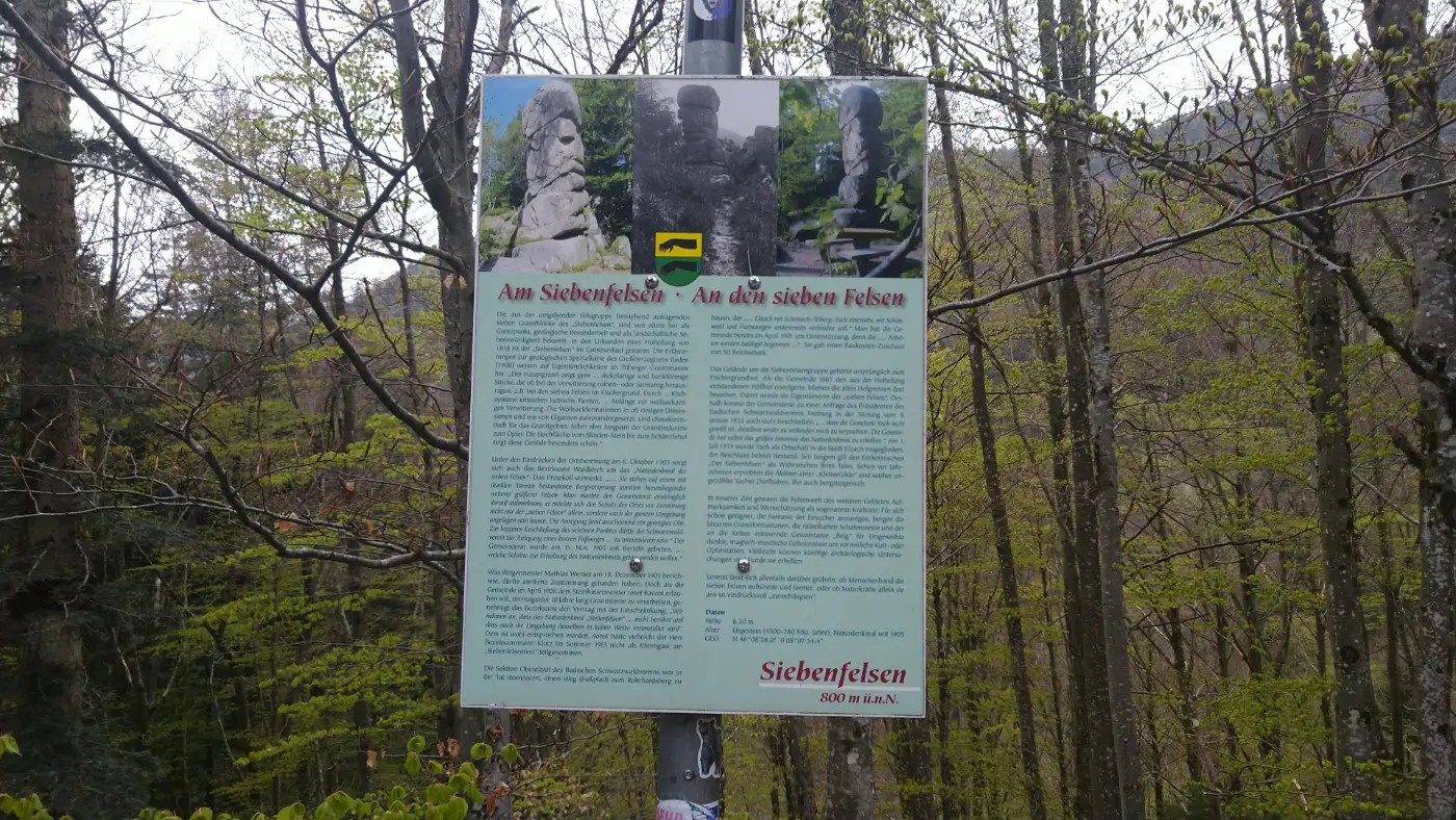 Nach einigen Kilometern entdecken wir ein kleines, unscheinbares Schild mit einer blauen Raute, das nach links weist: Hier zweigt der schmale Pfad ab, der uns hinunter zum Siebenfelsen führt - dem Höhepunkt unserer Wanderung. Tief im Schwarzwald verbirgt sich der geheimnisvolle Siebenfelsen - eine auffällige Formation aus sieben wuchtigen Felsblöcken, die wie zufällig aufeinandergeschichtet wirken. Ob dieses Naturgebilde allein durch Jahrtausende währende Erosion entstand oder ob menschliche Hände einst nachgeholfen haben, ist bis heute ungeklärt und nährt zahlreiche Legenden. Umgeben von dichtem Wald und von Moosen überzogen, entfaltet die Formation eine fast mystische Ausstrahlung. Zwischen den Felsspalten bieten sich eindrucksvolle Ausblicke ins Tal, und die stille Lage macht diesen Ort ideal für eine Rast - ein echter Kraftplatz abseits des Trubels.Die Felsblöcke des Siebenfelsen