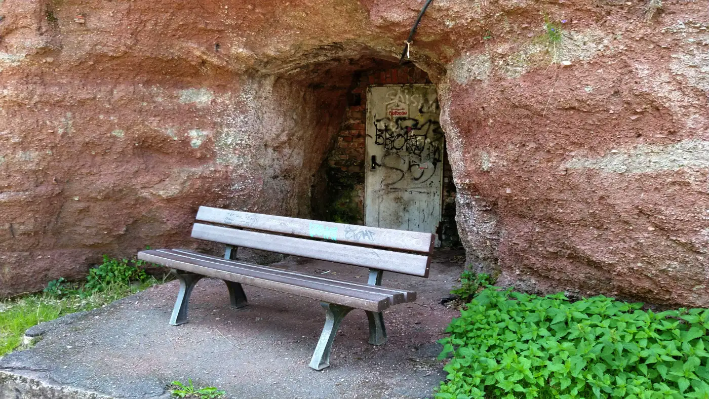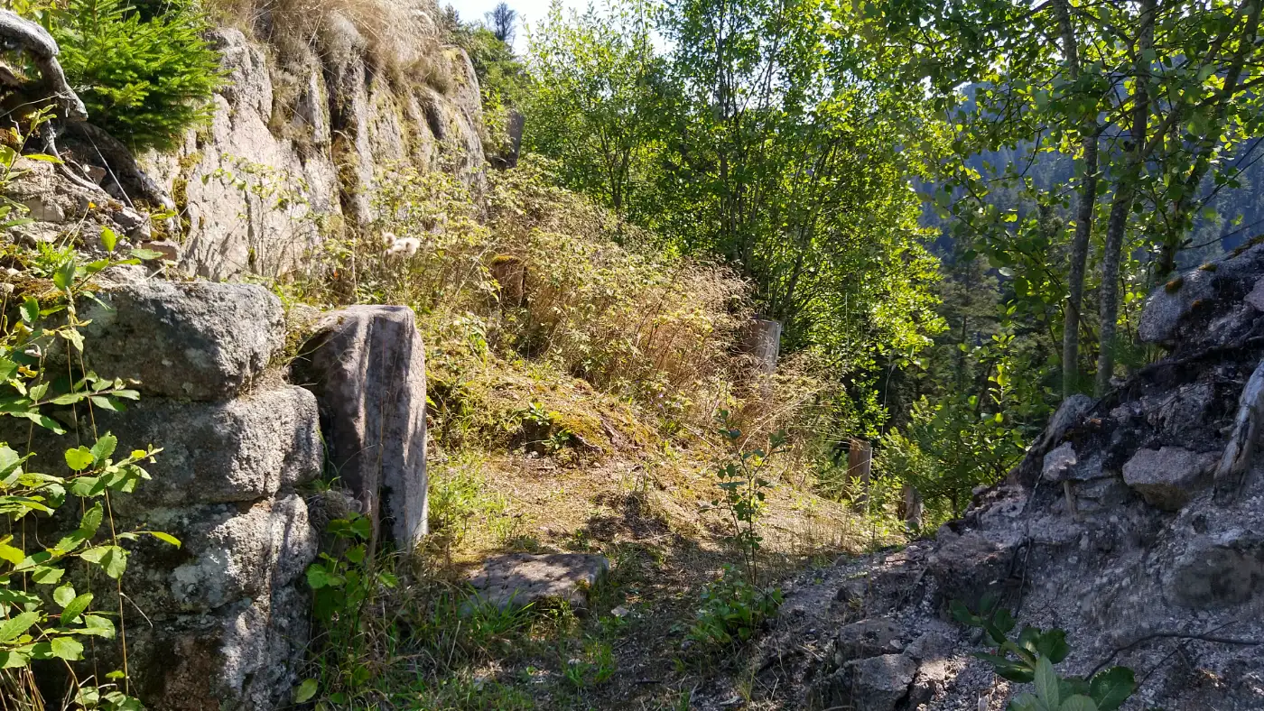 Der Weg steigt nun stetig an und führt uns durch dichten Wald, bis sich das Grün plötzlich öffnet. An einer kleinen Bank legen wir eine kurze Pause ein - genau hier zeigt sich uns zum ersten Mal die Ruine Berneck. Zwischen den Baumwipfeln erkennen wir den markanten Felsen, auf dem die Burg einst errichtet wurde. Schon aus der Distanz wirkt ihre Lage eindrucksvoll und macht deutlich, warum dieser Platz über dem tief eingeschnittenen Tal gewählt wurde.Weg zur Burg Berneck
