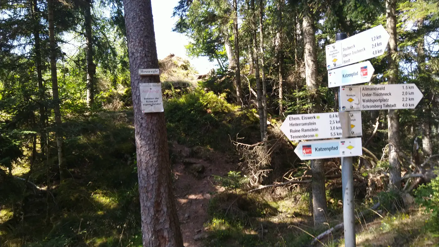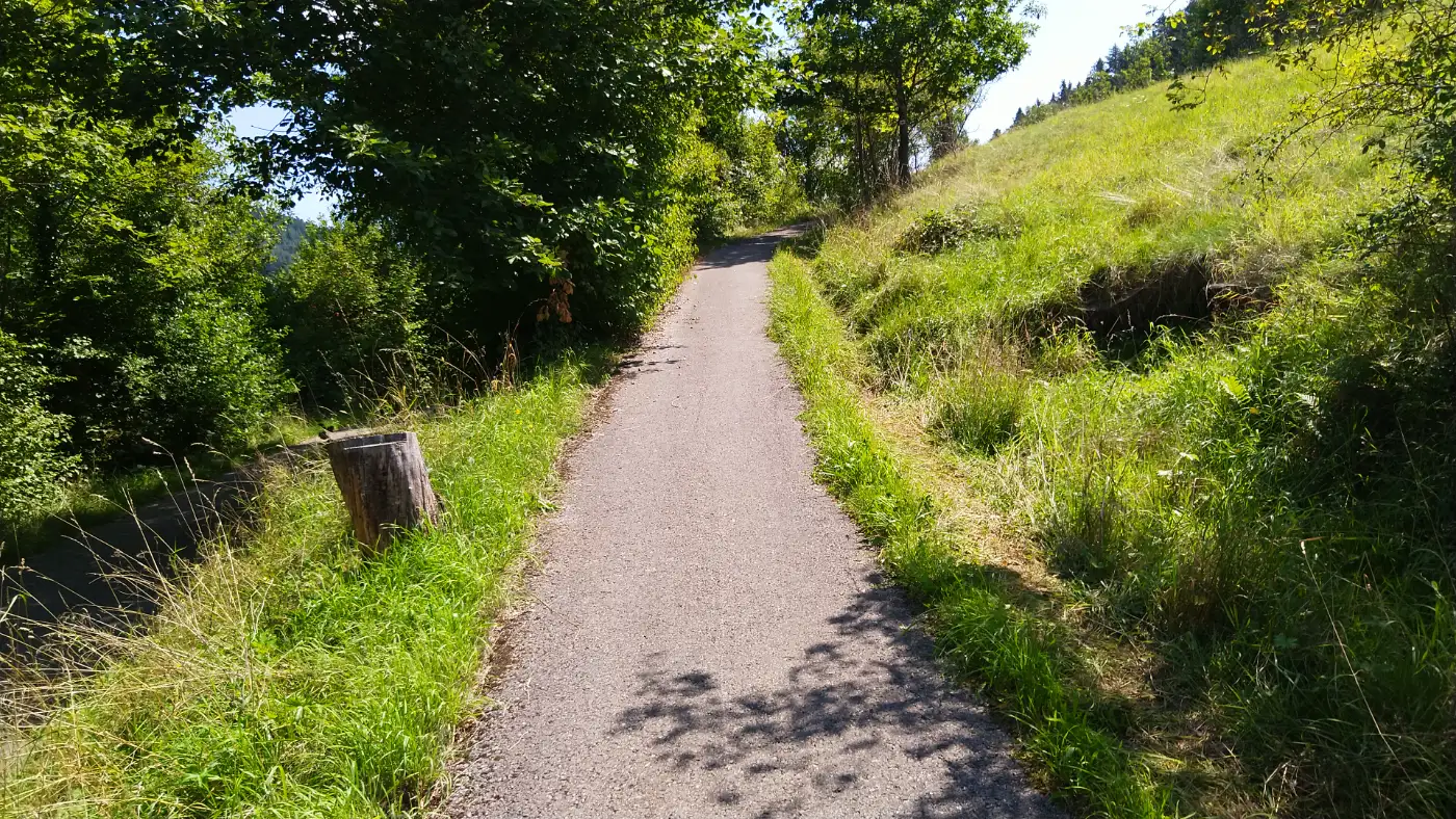 Für den Rückweg wählen wir erneut einen Waldweg, der stetig abwärts führt und teilweise in sanften Serpentinen durch dichten Buchen- und Tannenwald ins Schramberger Tal verläuft. Während wir die letzten Höhenmeter hinter uns lassen, lassen wir die Eindrücke der beiden Burgruinen, des idyllischen Weilers Tischneck und der zahlreichen Aussichtspunkte noch einmal Revue passieren. Zufrieden und erfüllt erreichen wir schließlich unseren Ausgangspunkt am Busbahnhof und schließen damit eine abwechslungsreiche und eindrucksvolle Wanderung ab.Diese Tour wurde am 09.08.2025 von einer realen Person erwandert, fotografiert und beschrieben. Die GPS-Daten der Fotos wurden vor Ort erfasst und dienten zur exakten Rekonstruktion der Route.