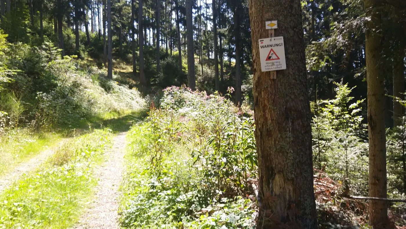 Vom Aussichtspunkt führt uns der Weg nun bergab - ein schmaler, steiler Pfad, der den passenden Namen Heuwegle trägt. Schon am Beginn weist ein Schild darauf hin, dass hier Vorsicht geboten ist, denn die Strecke ist stellenweise abschüssig und verlangt Trittsicherheit. Schritt für Schritt steigen wir tiefer, stets begleitet von dichtem Wald, der nur gelegentlich den Blick ins Tal freigibt. Trotz der Herausforderung genießen wir den Abstieg, denn am Ende dieses Weges wartet die Ruine Berneck.Auf der Burgruine Berneck