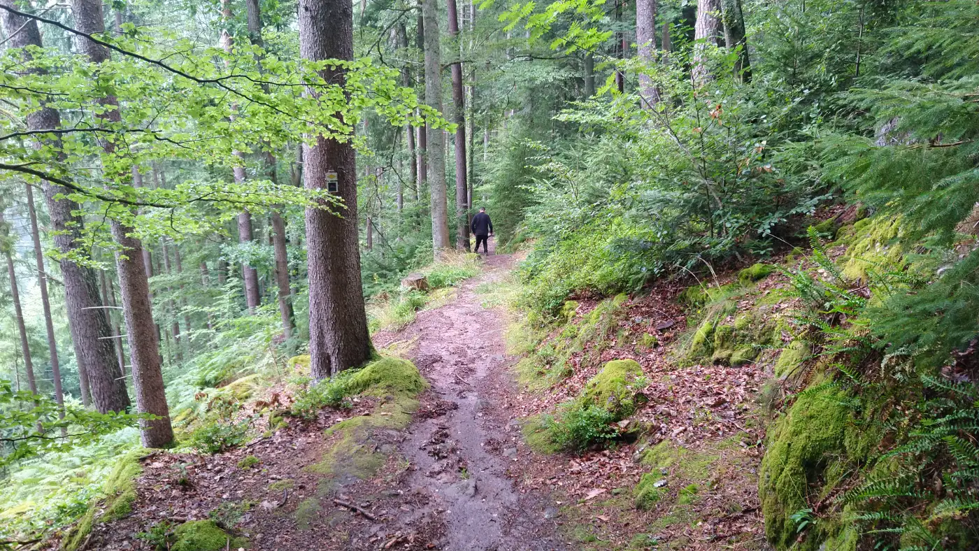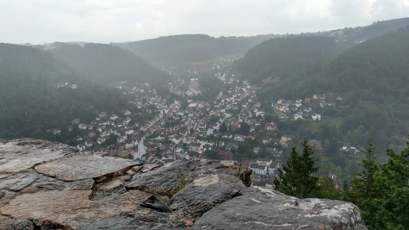 Rund um die Ruine genießen wir eindrucksvolle Ausblicke auf Schramberg und die verzweigten Täler des Schwarzwalds. Tief unter uns liegt die Stadt, eingerahmt von bewaldeten Höhenzügen. Wir nehmen uns Zeit, die Aussicht bewusst wahrzunehmen und entdecken bekannte Orte aus ungewohnter Perspektive. Dieser Abschnitt zählt zu den landschaftlichen Höhepunkten der Tour.Das Lauterbachtal