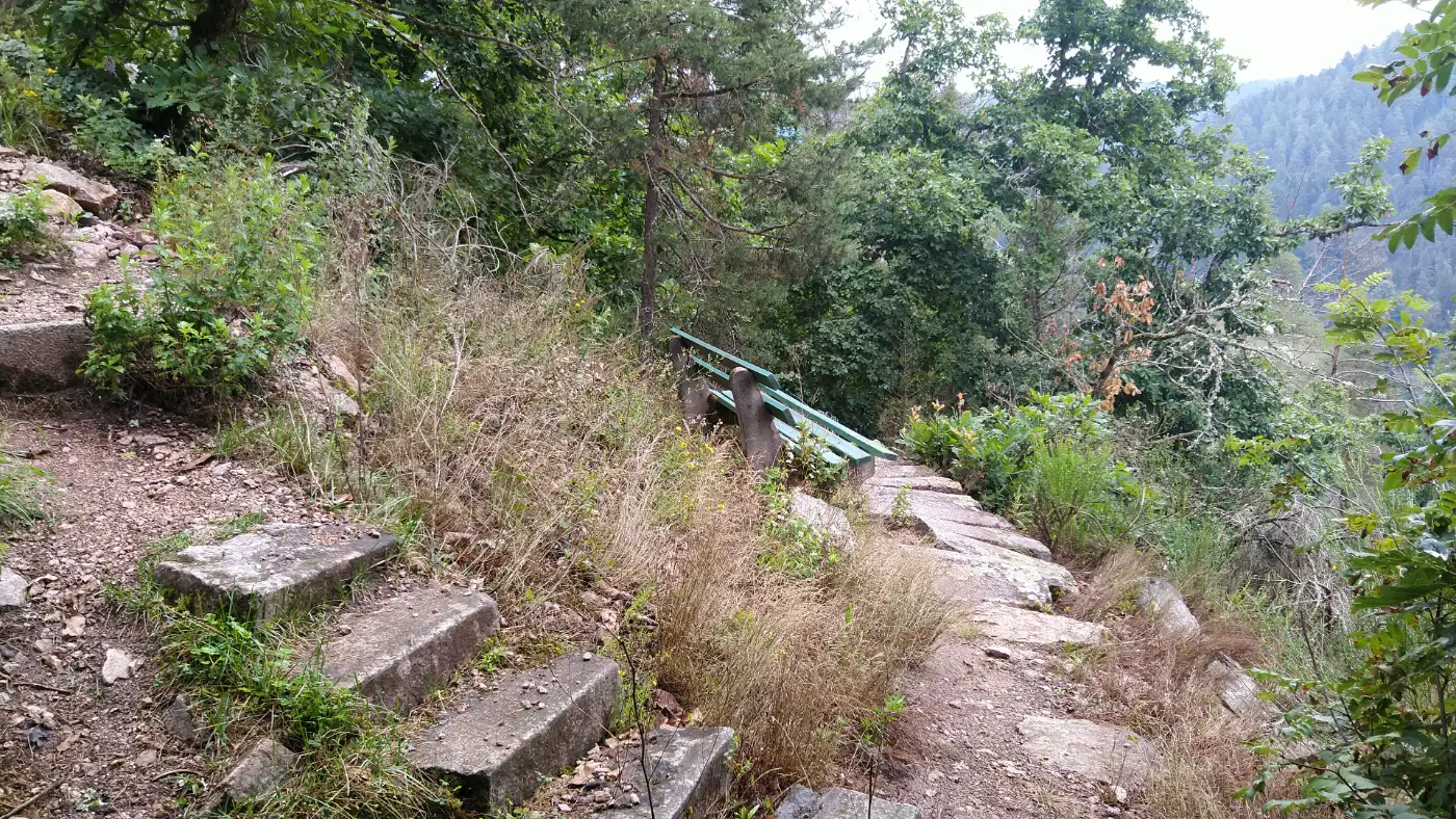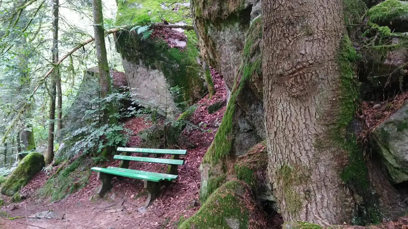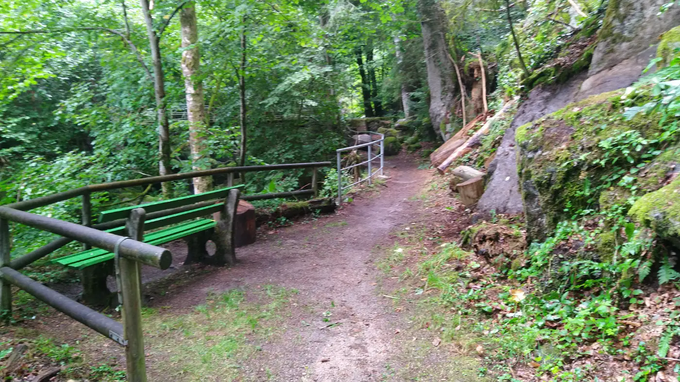 Nach den aussichtsreichen Höhenwegen steigen wir hinab ins Lauterbachtal. Der Abstieg ist abwechslungsreich, das Gelände stellenweise schroff und eindrucksvoll. Begleitet vom stetigen Rauschen des Lauterbachs wandern wir durch schattige Waldpassagen, vorbei an feuchten Felswänden und hoch aufragenden Tannen. Das Tal wirkt ursprünglich und abgeschieden und bildet einen wilden, fast rauen Kontrast zu den offenen und exponierten Burghöhen, die wir zuvor durchquert haben.Burgruine Falkenstein